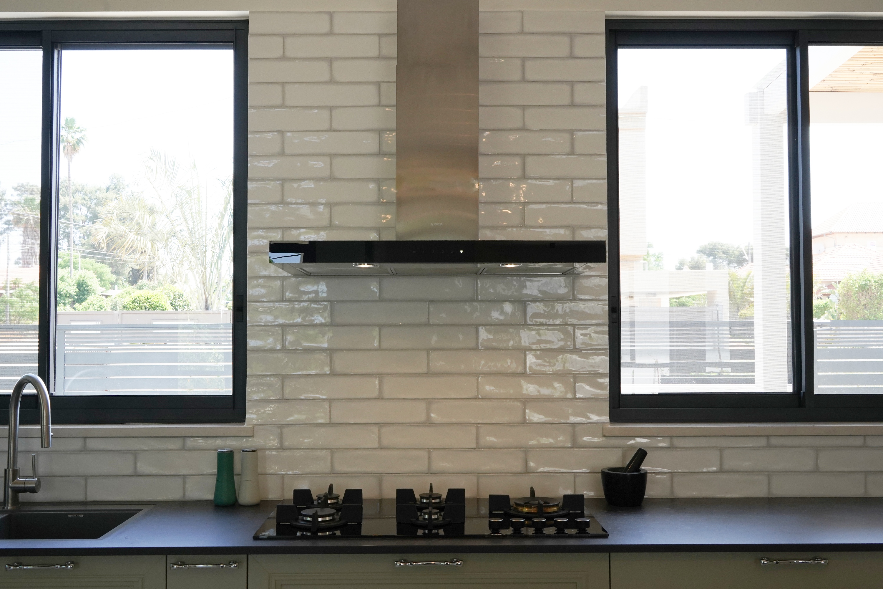 קיר מטבח עם חיפוי בריקים לבנים מבריקים, בין שני חלונות גדולים המכניסים אור טבעי. מראה מודרני ונקי, עם קולט אדים נירוסטה וכיריים שחורות על משטח כהה שמאזן את הלובן.