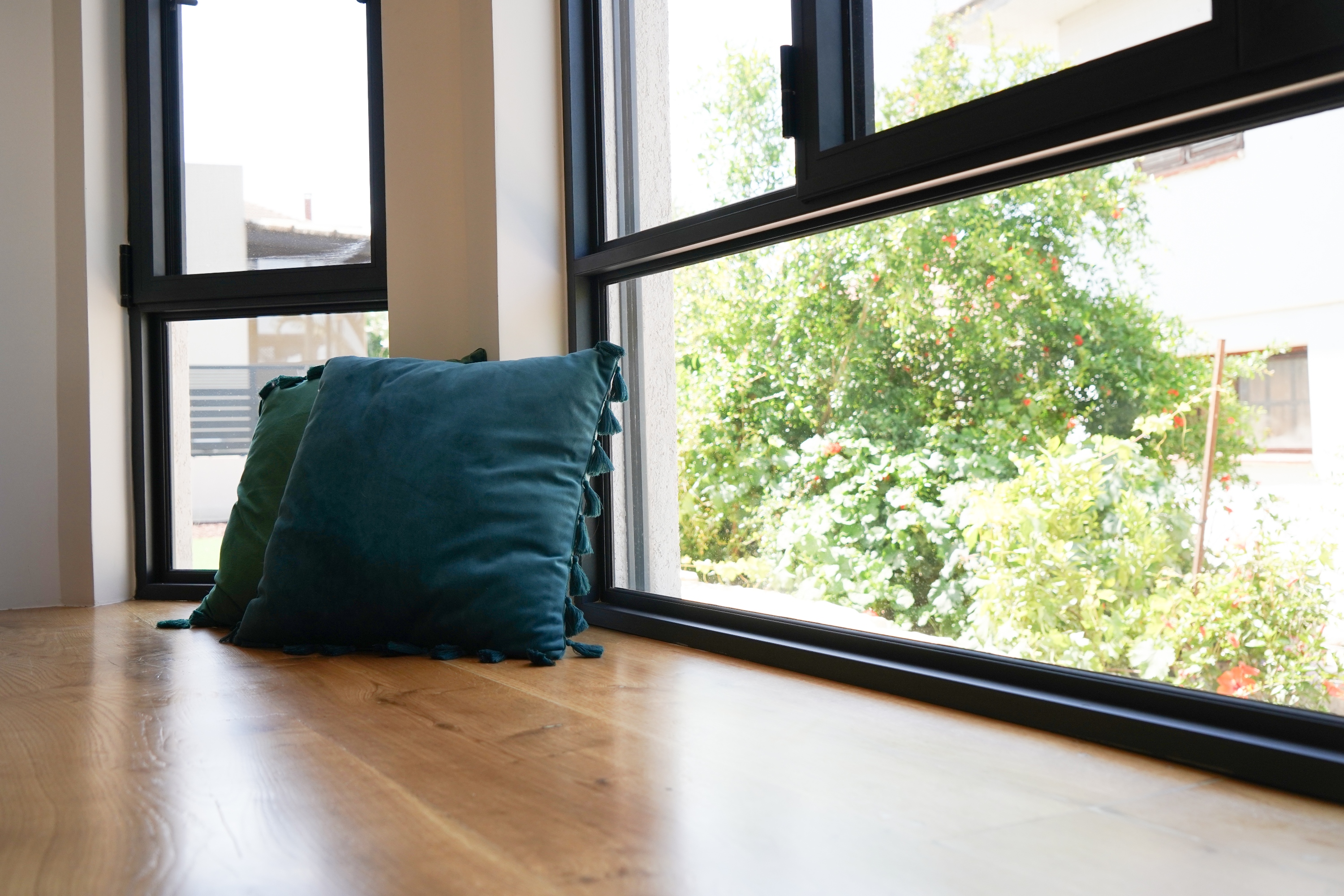 פינת ישיבה אינטימית לצד חלון פנורמי עם כריות קטיפה בגוון טורקיז עמוק. הרצפה מעץ טבעי מוסיפה חמימות, בעוד האור החודר מהגינה הירוקה יוצר תחושת רוגע וחיבור לטבע.