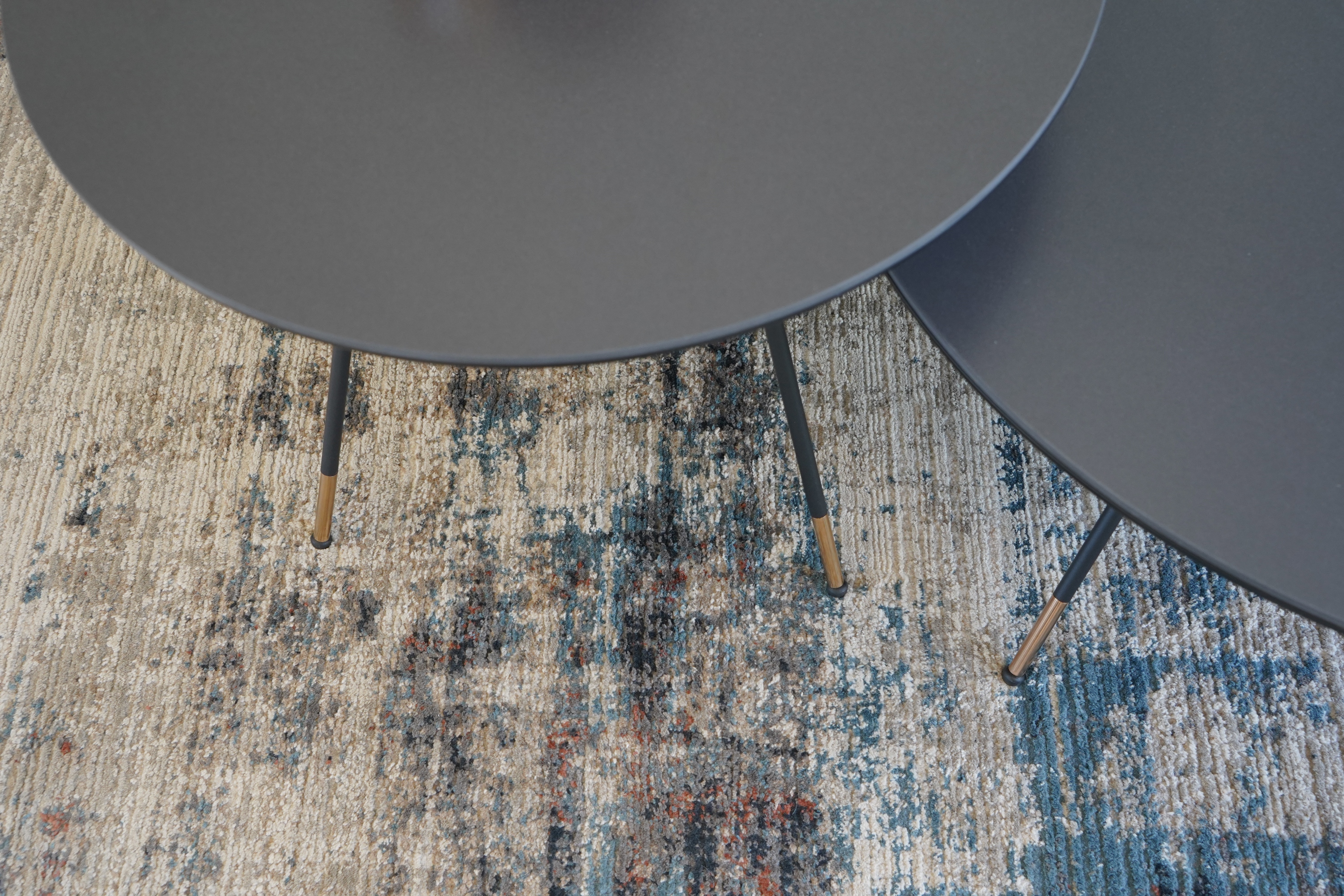 שילוב של שטיח בגווני כחול, אפור וחום עם טקסטורה עשירה מעניק חמימות ועומק לחלל. השולחנות בעיצוב מודרני עם רגלי מתכת דקיקות בגימור זהב מוסיפים אלגנטיות וקונטרסט עכשווי.
