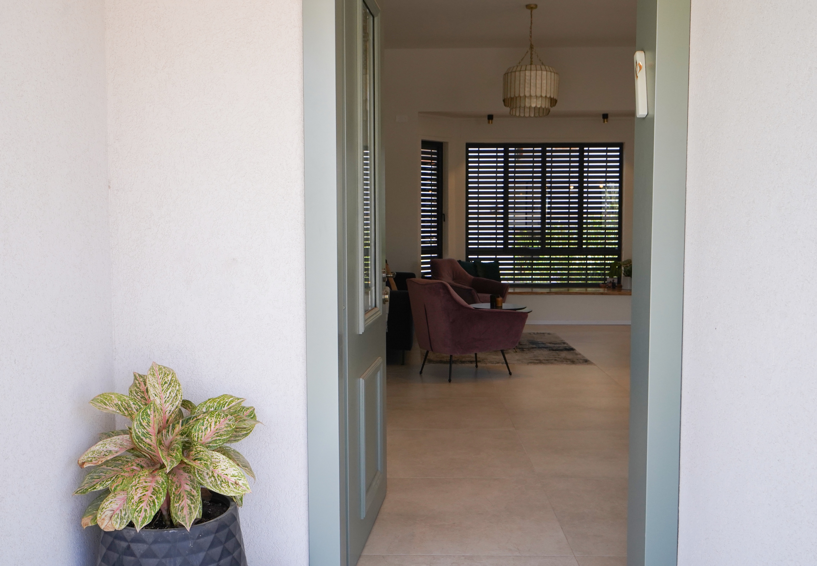 המבט דרך הדלת חושף חלל מזמין ומואר, המעוצב בקווים נקיים עם שילוב הרמוני של ריהוט בגווני בורדו עמוקים, תריסי עץ כהים שמכניסים אור טבעי מבוקר, ותאורה תלויה בגוון זהב רך המוסיפה חמימות. הצמח שבכניסה שובר את הקו הנקי ומכניס נגיעה טבעית ורעננה לחלל.