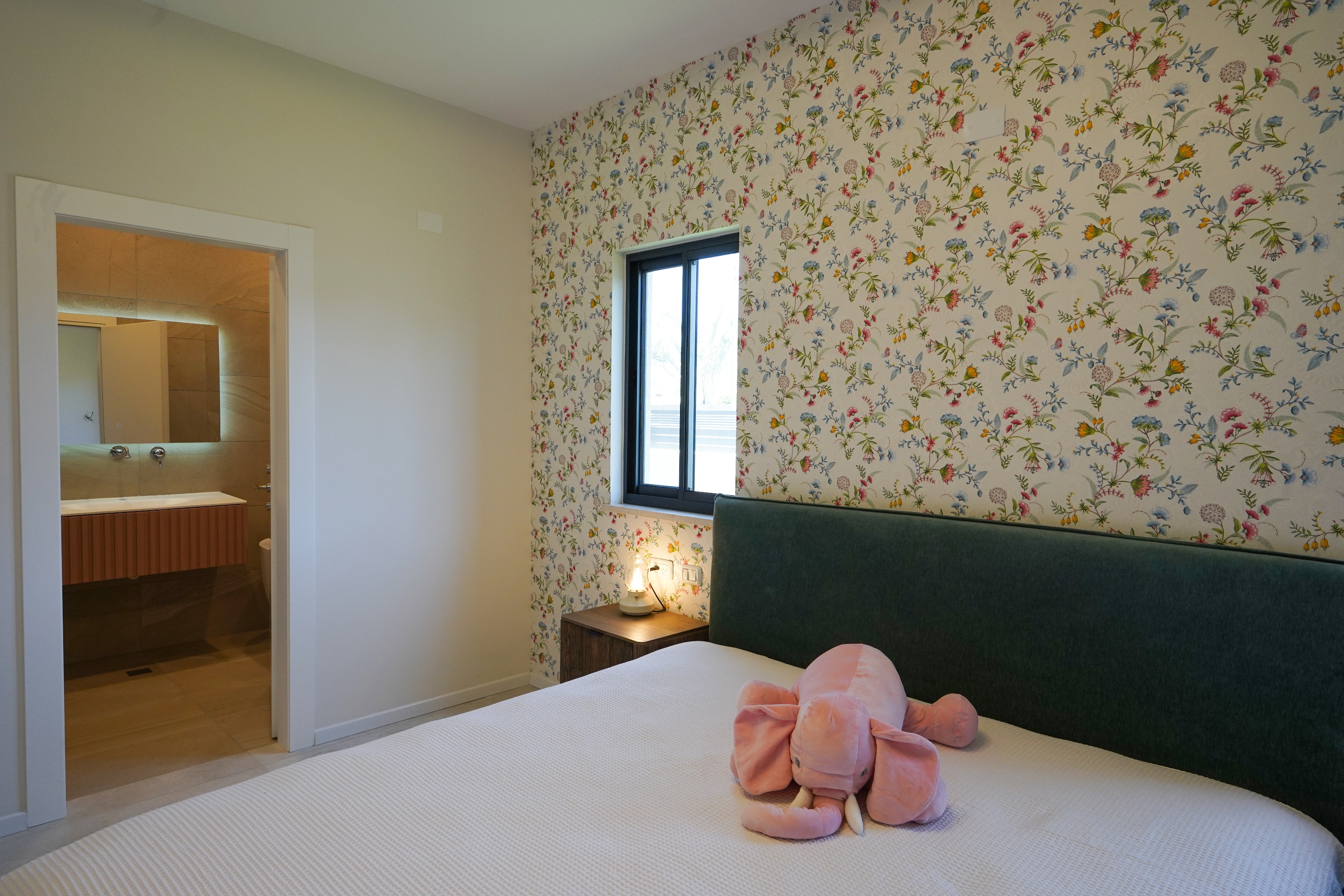 חדר שינה אינטימי עם עיצוב רך ונעים, הכולל קיר דומיננטי עם טפט פרחוני צבעוני שמוסיף חיות ועניין לחלל. המיטה מרופדת בראש ירוק כהה המשתלב עם צבעוניות הטפט. חלון שחור במסגרת מודרנית מאפשר כניסת אור טבעי, ושידת לילה עם מנורת קריאה מוסיפה פונקציונליות. הדלת לחדר הרחצה הפתוח יוצרת רצף עיצובי, תוך שמירה על קווים נקיים וחומרים חמימים.