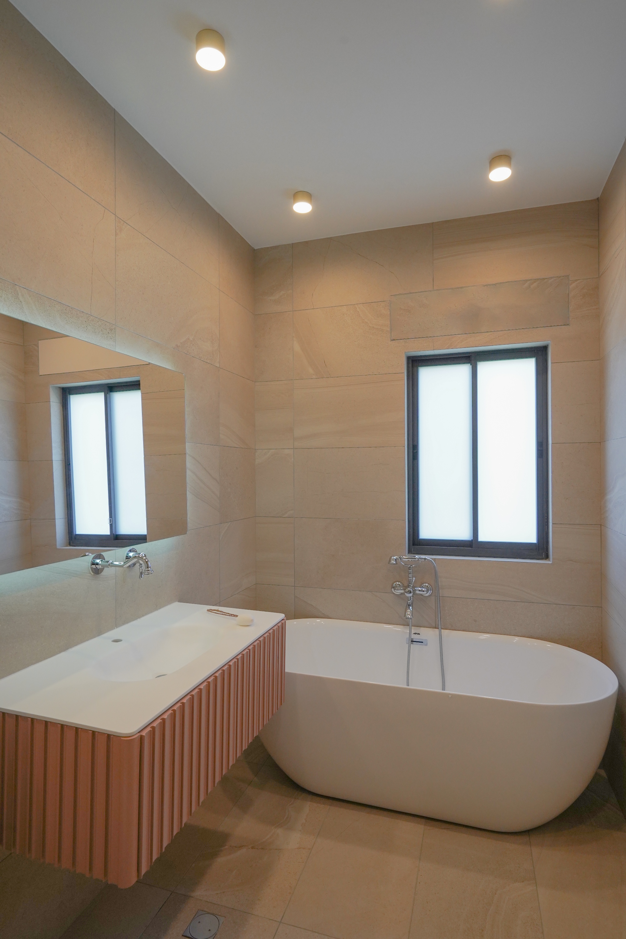 חלל מודרני ומואר המאופיין בקווים נקיים, ריצוף בגוון בהיר, מראה גדולה שמרחיבה את התחושה המרחבית, וריהוט מינימליסטי בגוונים ניטרליים, היוצרים אווירה רגועה, מסודרת ואלגנטית.