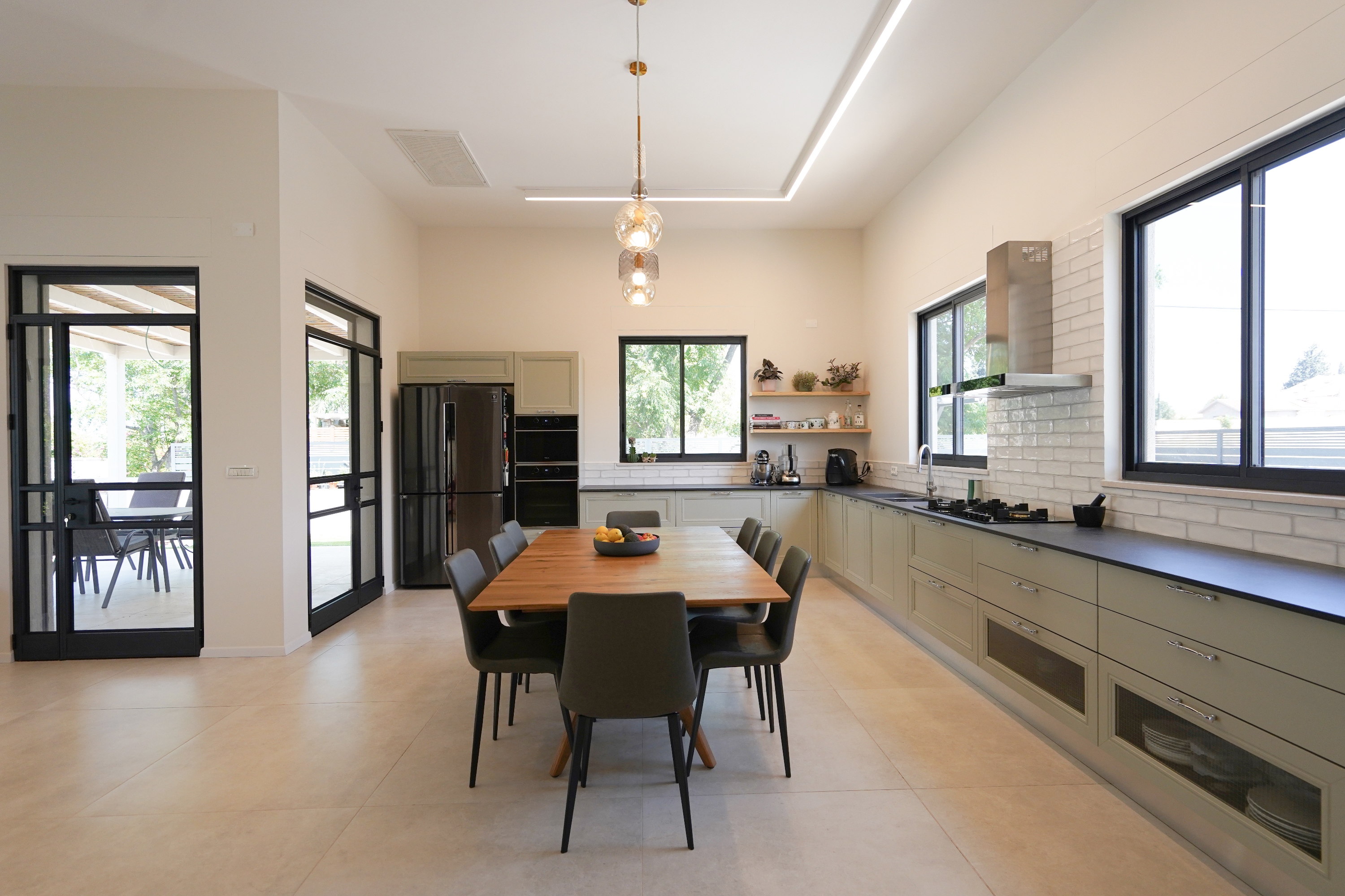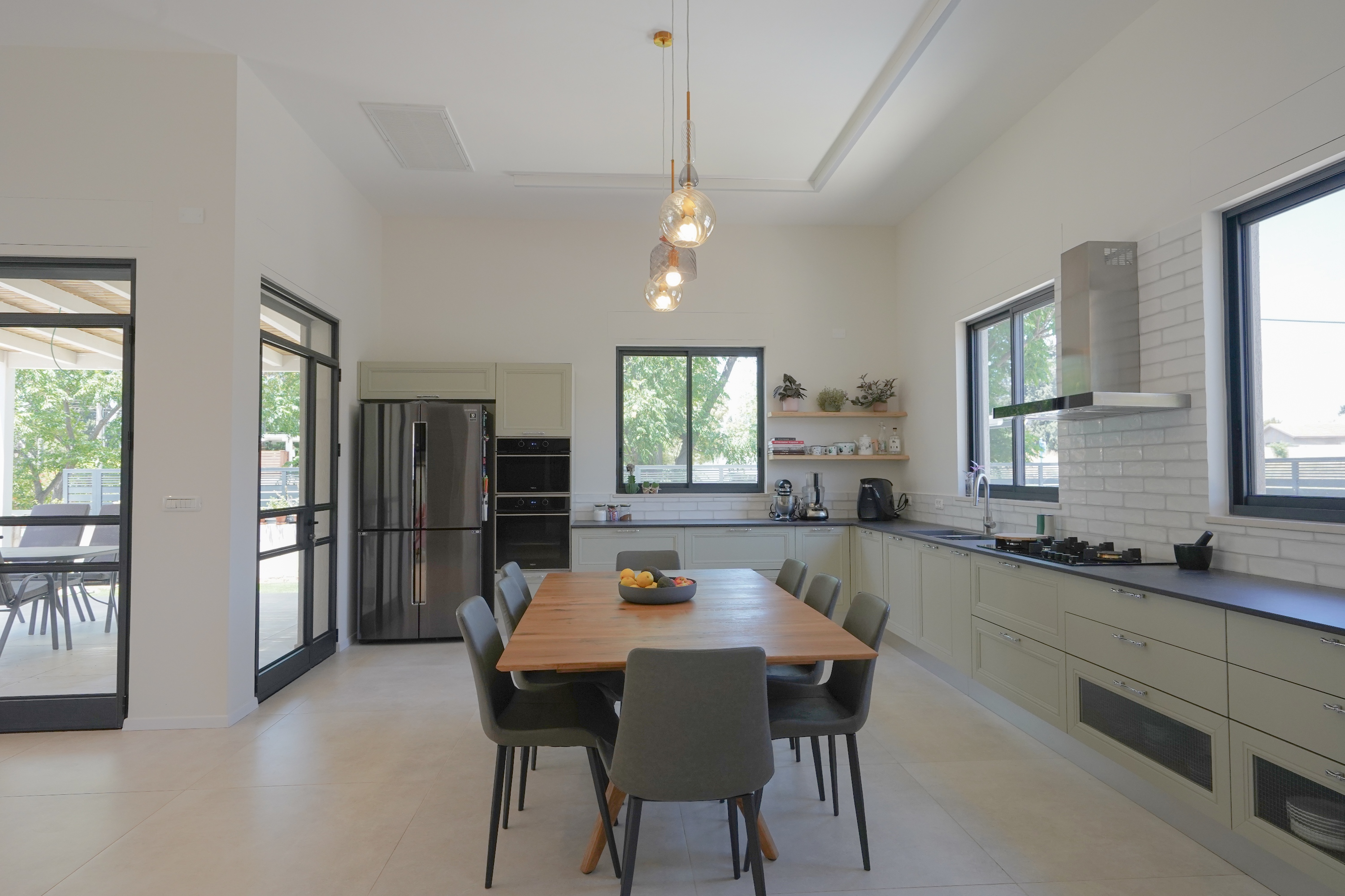 המטבח מעוצב בקווים נקיים ובשפה מודרנית-כפרית, עם חזיתות בגוון ירוק-אפור רך, משטח עבודה כהה וקרמיקה לבנה בגימור בריק. האור הטבעי שנכנס מהחלונות הרחבים יחד עם גוף התאורה המרכזי מוסיפים חמימות ורכות לחלל. פינת האוכל שבמרכז המטבח יוצרת חיבור נעים בין אזור הבישול למפגש המשפחתי.