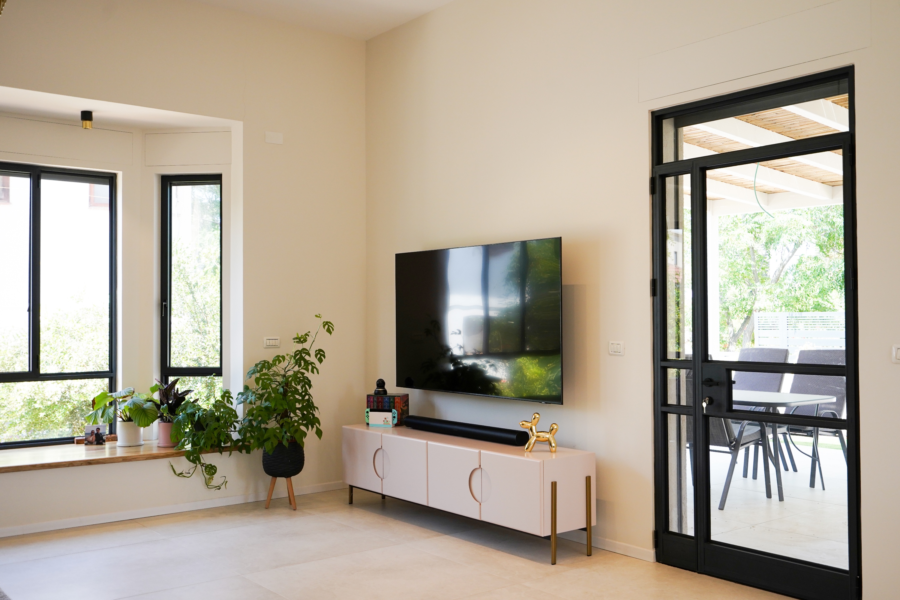 פינת הטלוויזיה מעוצבת בקו מודרני ומינימליסטי, עם קונסולת מדיה בגוון בהיר ורגלי מתכת זהובות שמשלבות אלגנטיות ופונקציונליות. קיר הטלוויזיה נשאר נקי ללא עומס ויזואלי, ומולו נפתח חלון רחב עם אדן עץ טבעי וצמחייה שמכניסה חיים ורעננות לחלל. הדלת השקופה מובילה למרפסת וממשיכה את תחושת הפתיחות והקשר עם החוץ.