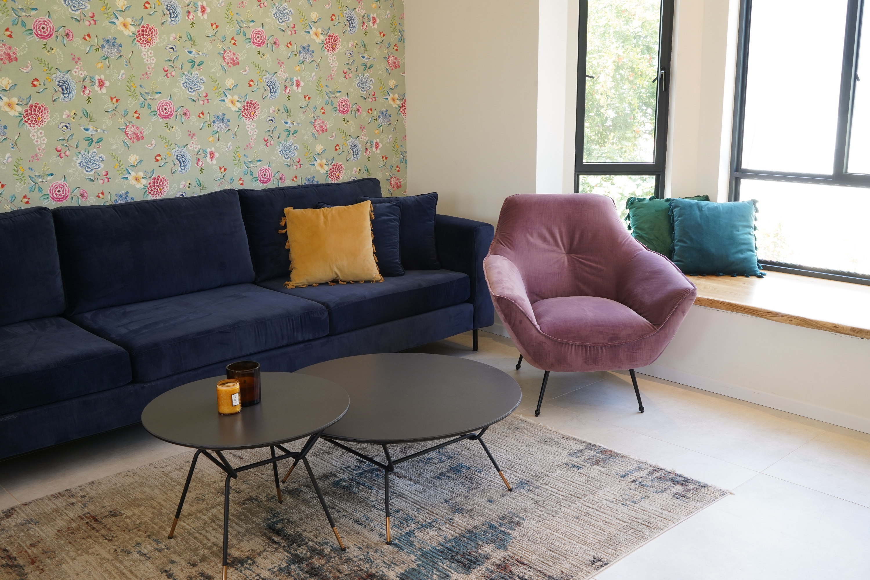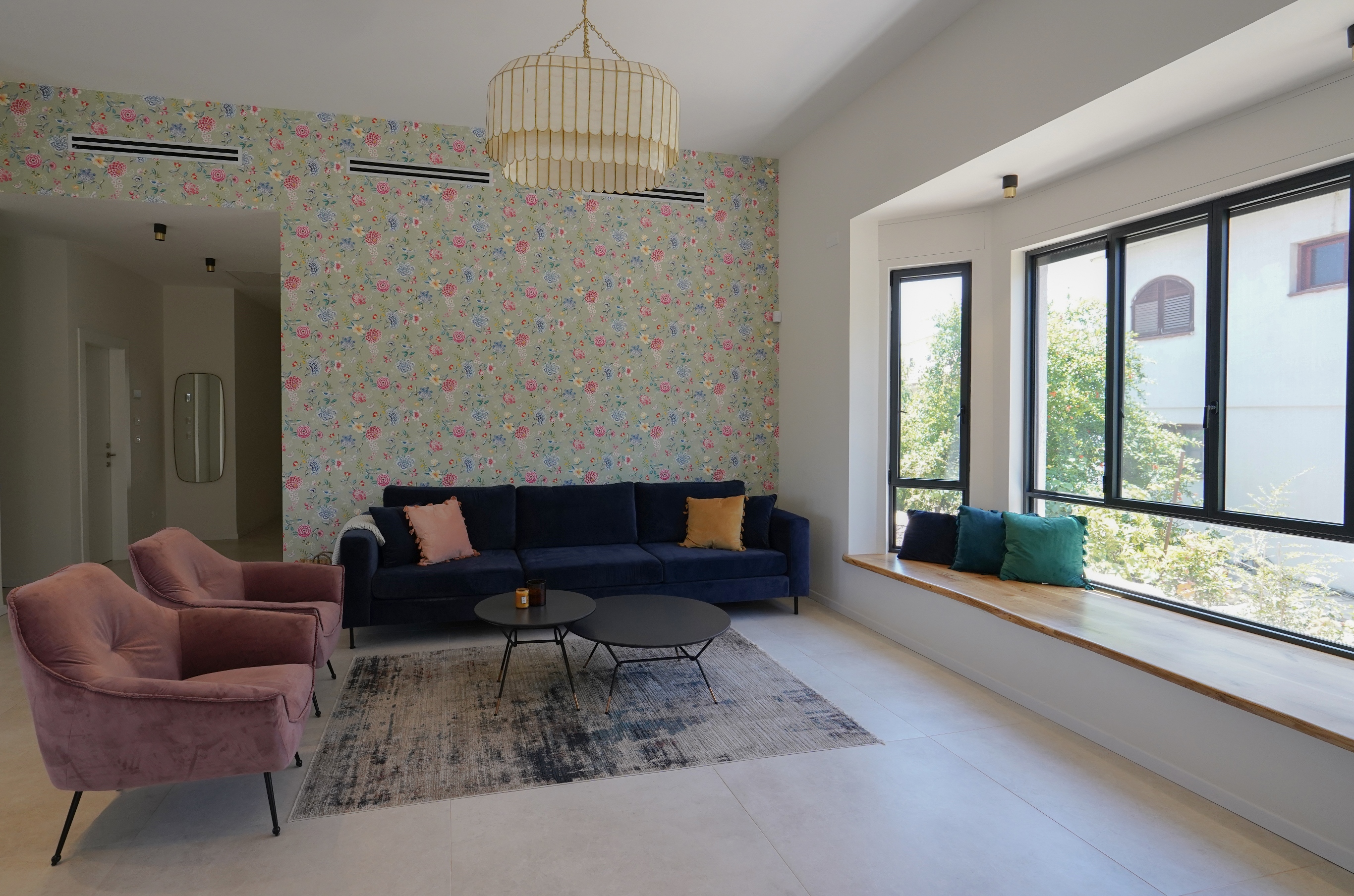 הסלון עוצב באווירה חמימה ומשפחתית עם שילוב של סגנון מודרני ונגיעות רטרו. הקיר המרכזי חופה בטפט פרחוני רך המכניס צבע וטקסטורה, בעוד שהריהוט – ספה כחולה וכורסאות בגוון ורוד מעושן – מוסיף עומק ואופי. החלל מואר באור טבעי נדיב הודות לחלון רחב עם ספסל ישיבה מעץ, המהווה גם אזור מנוחה נעים עם צמחייה רעננה. גופי התאורה והתקרה הנקייה משלימים את המראה המעודכן והנעים של החלל.