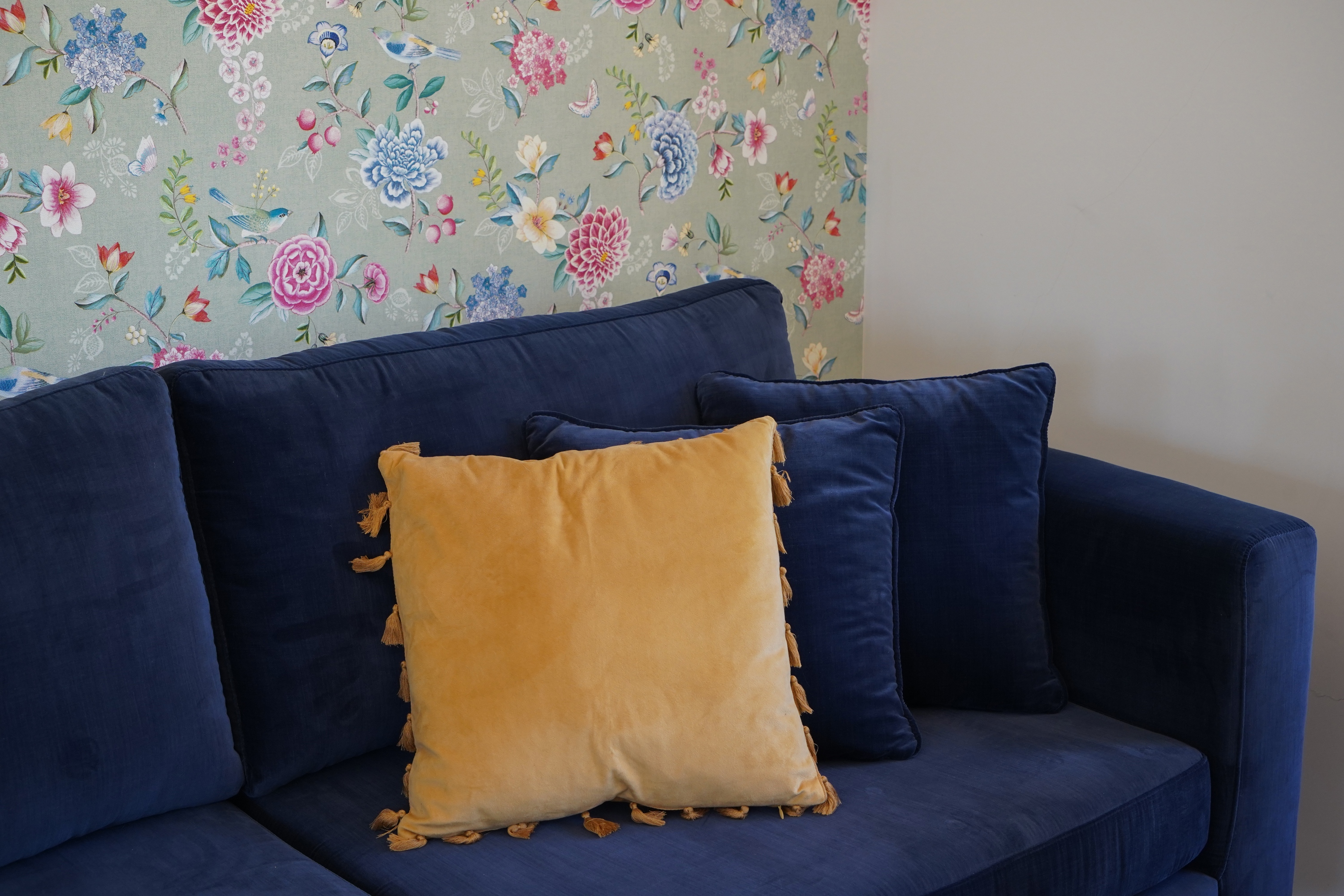 טקסטיל עשיר בספה כחולה עם כריות נוי בגווני כחול וצהוב, על רקע טפט פרחוני צבעוני, יוצר שילוב חמים ומזמין עם ניחוח קלאסי ונגיעות וינטג'.