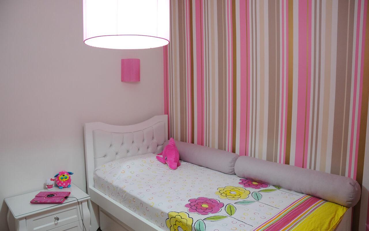 Детская для девочки украшена яркими полосатыми обоями, но не заполняет все пространство пестротой цвета, а лишь поддерживает атмосферу позитива и веселья. Спальня выполнена в пастельных тонах - эти цвета умиротворяют и расслабляют.