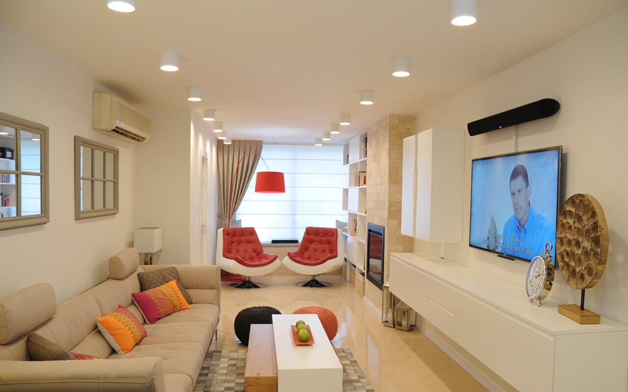В центре комнаты был встроен в стену камин, и дизайн салона сразу превратился в подобие уютного коттеджа в Норвегии. Любителей скандинавского стиля порадует эта идея, ведь зимой на пол можно постелить ковер и утеплить атмосферу.