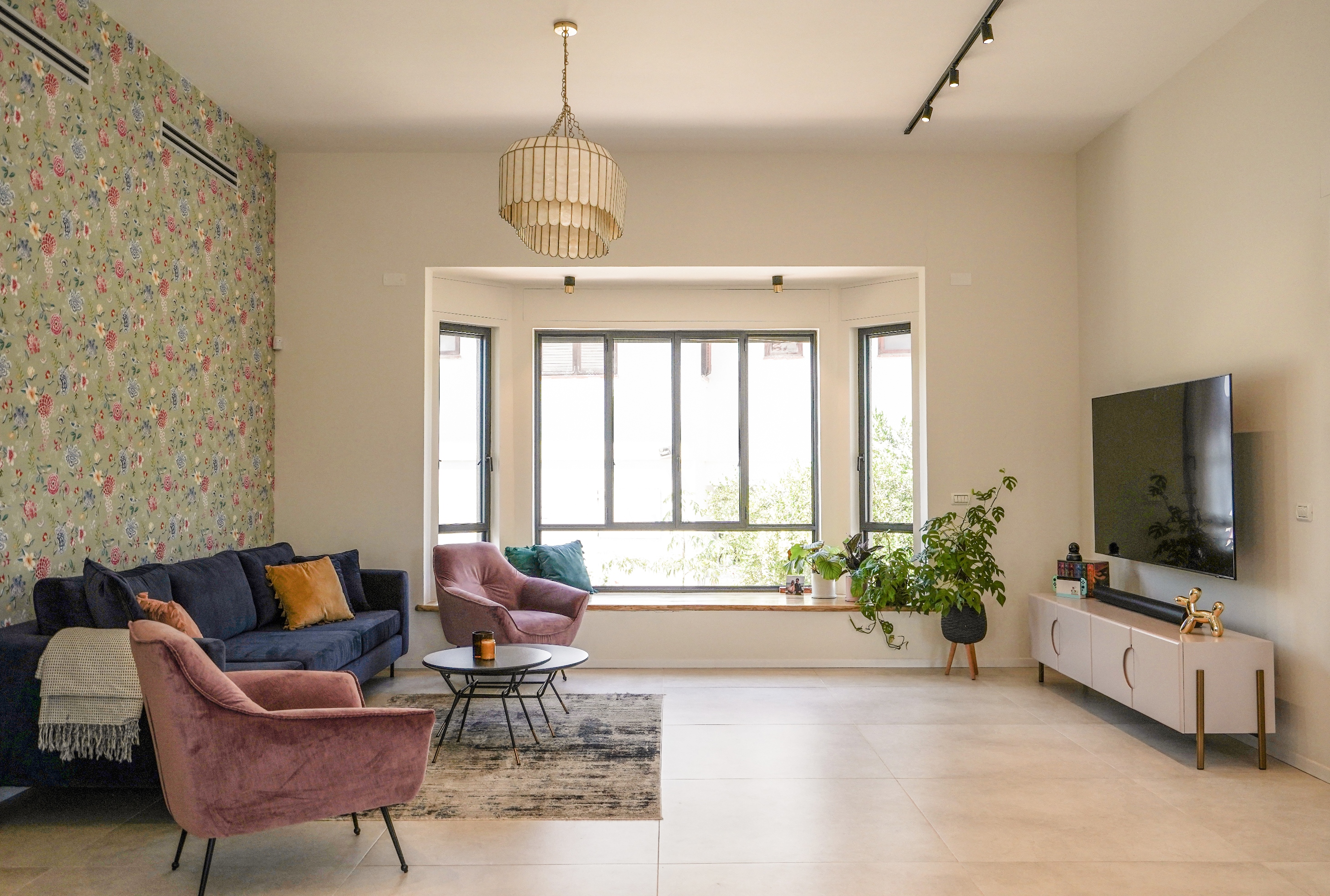 הסלון עוצב באווירה חמימה ומשפחתית עם שילוב של סגנון מודרני ונגיעות רטרו. הקיר המרכזי חופה בטפט פרחוני רך המכניס צבע וטקסטורה, בעוד שהריהוט – ספה כחולה וכורסאות בגוון ורוד מעושן – מוסיף עומק ואופי. החלל מואר באור טבעי נדיב הודות לחלון רחב עם ספסל ישיבה מעץ, המהווה גם אזור מנוחה נעים עם צמחייה רעננה. גופי התאורה והתקרה הנקייה משלימים את המראה המעודכן והנעים של החלל.