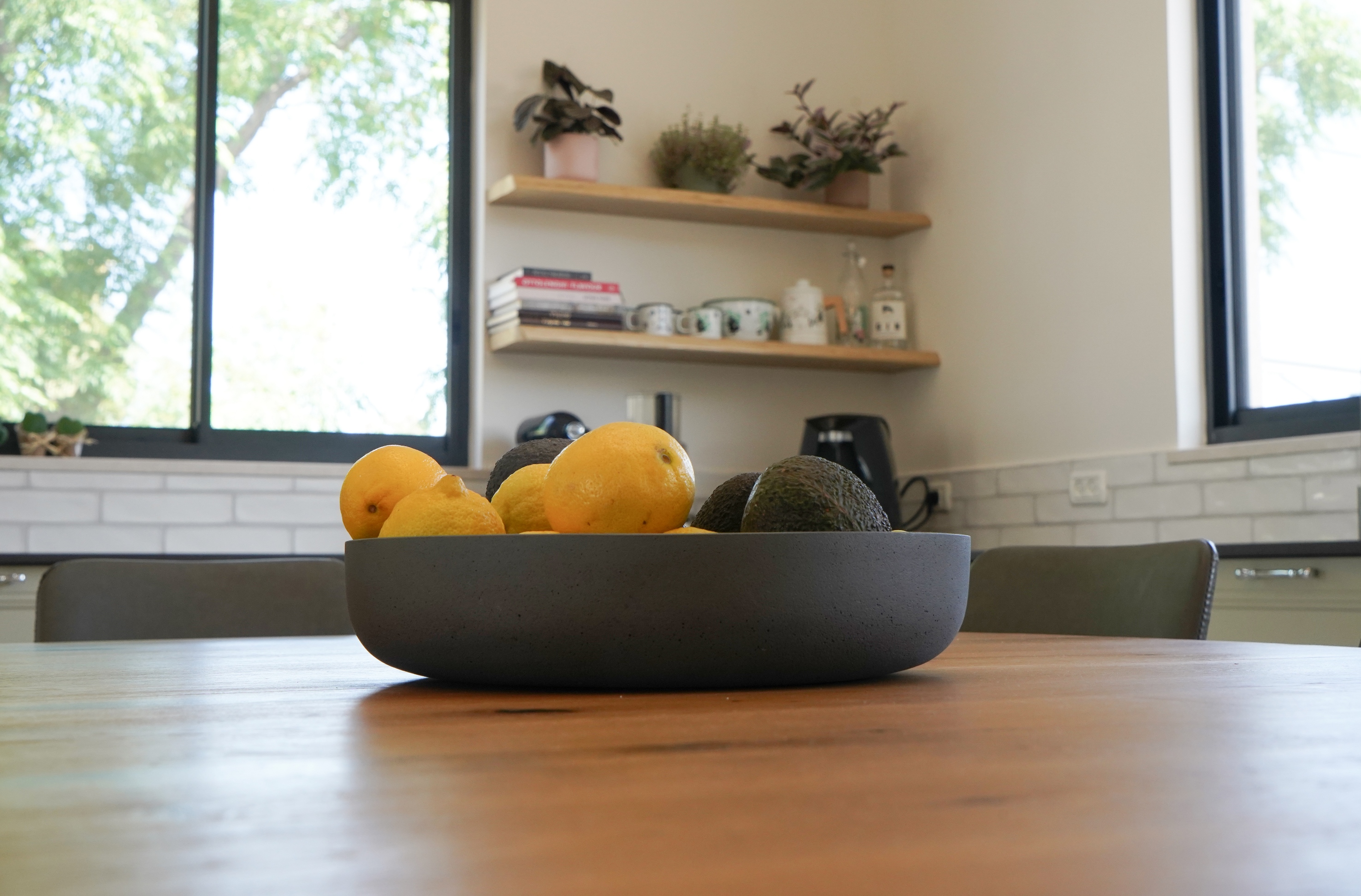 קערת בטון מינימליסטית עם פירות, מונחת על שולחן עץ חמים, יוצרת ניגוד טבעי לחלל מטבח מואר בסגנון מודרני-כפרי עם מדפים פתוחים ונגיעות ירוקות.