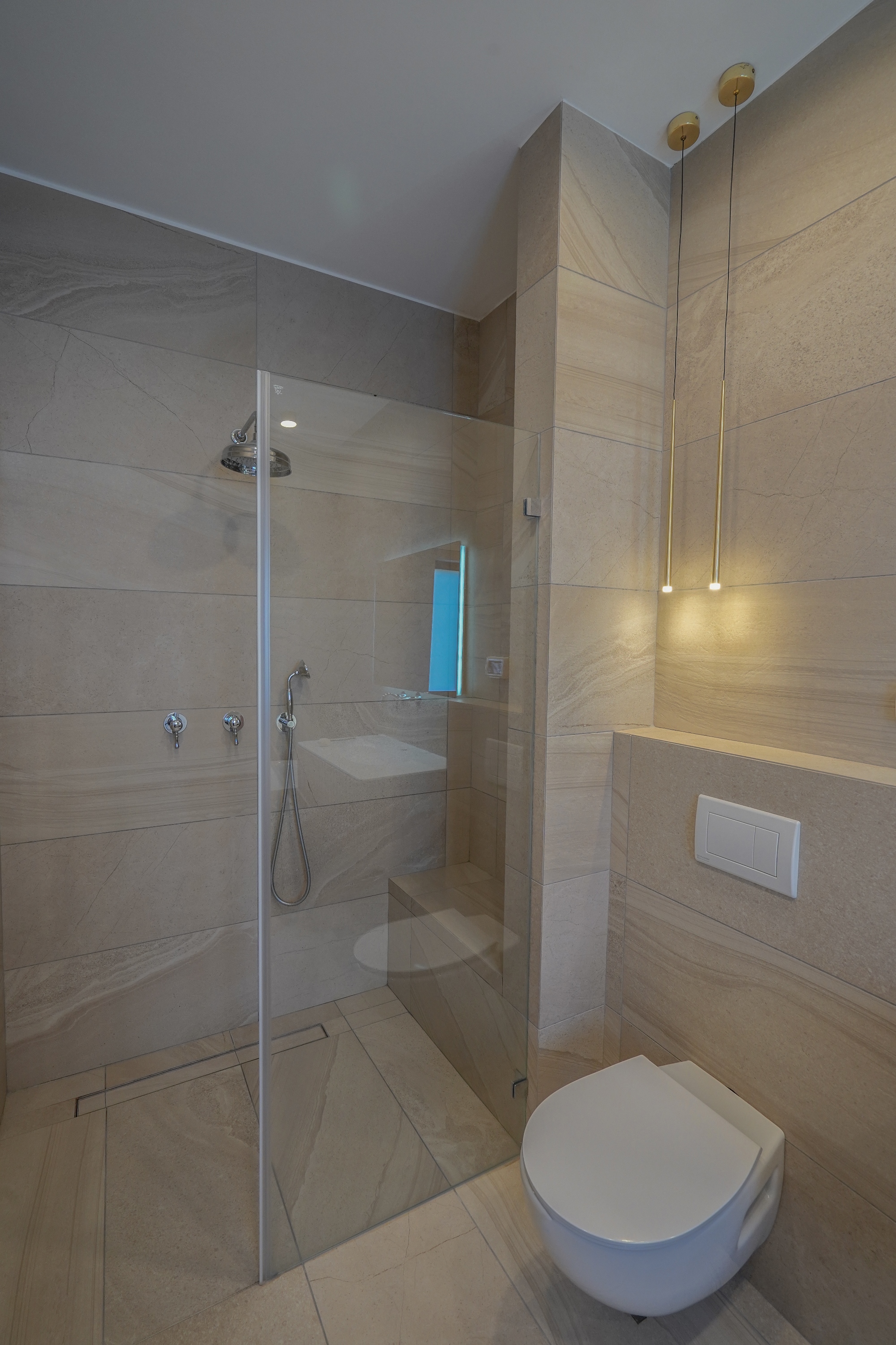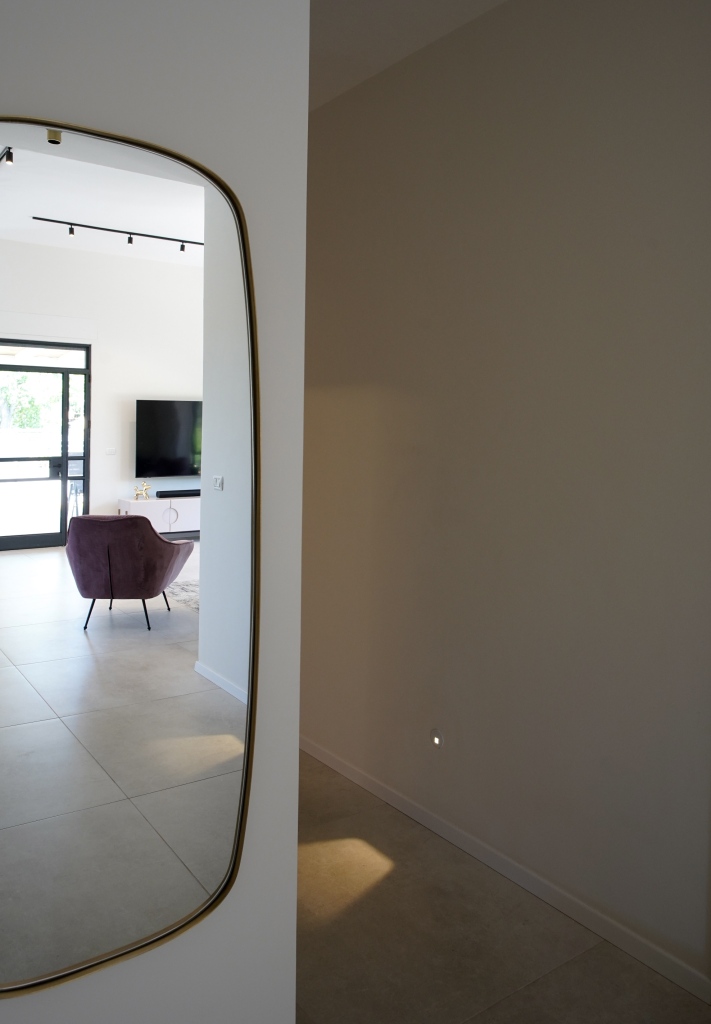 חלל מודרני ומואר המאופיין בקווים נקיים, ריצוף בגוון בהיר, מראה גדולה שמרחיבה את התחושה המרחבית, וריהוט מינימליסטי בגוונים ניטרליים, היוצרים אווירה רגועה, מסודרת ואלגנטית.