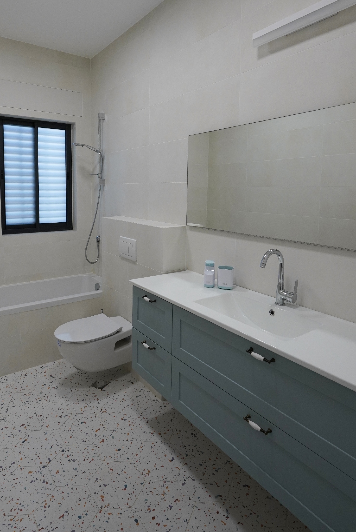 חדר רחצה בעיצוב מינימליסטי-מודרני, המאופיין בקווים נקיים, גוונים בהירים, ארונות בגוון כחול עמוק, וריצוף טרצו צבעוני שמוסיף עניין חזותי תוך שמירה על תחושת ניקיון, סדר ואור טבעי.