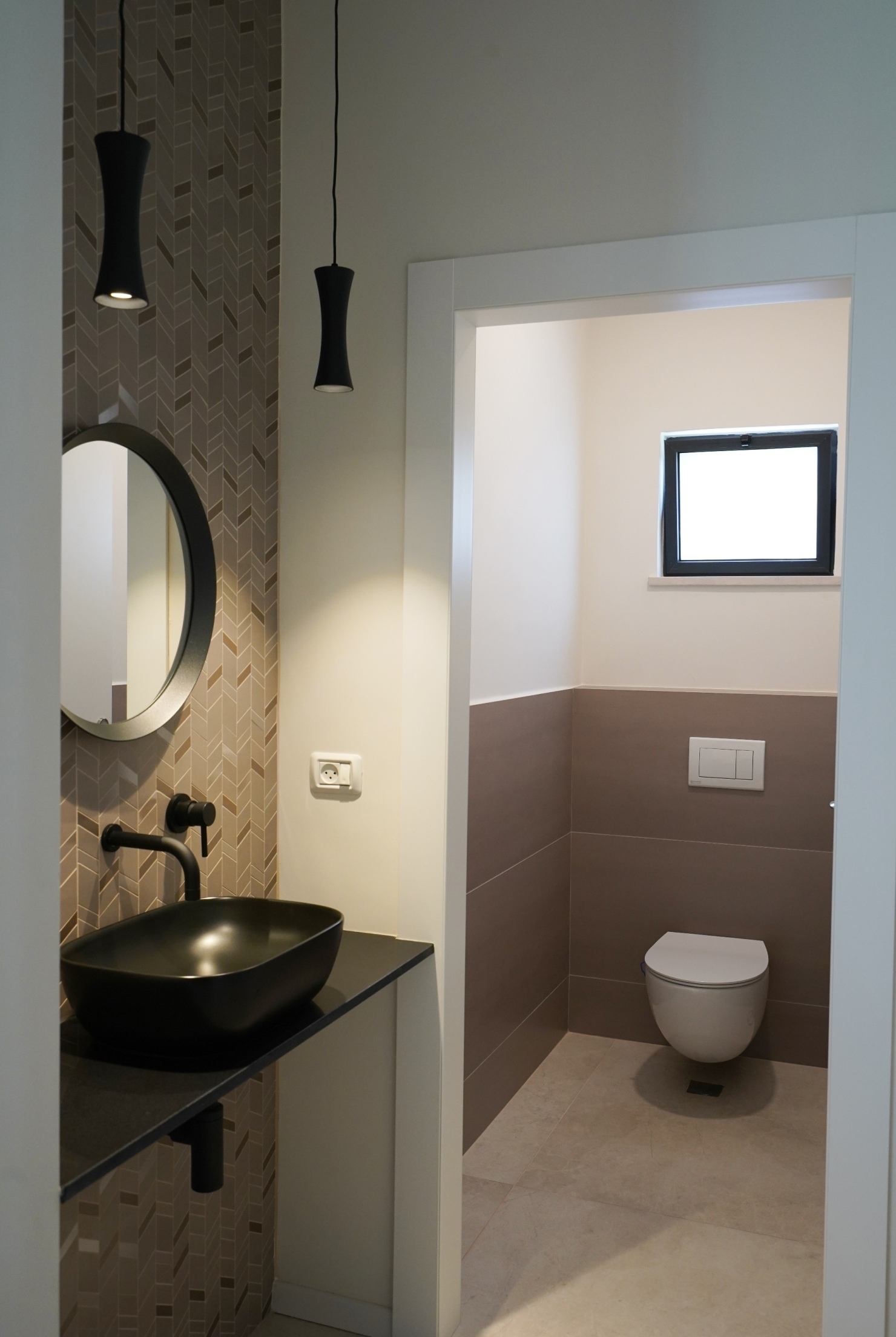 חדר רחצה בעיצוב עכשווי ומינימליסטי, המאופיין בשימוש בגוונים ניטרליים, כיור מונח בגימור שחור מט, אריחים גיאומטריים דקורטיביים, ותאורה תלויה שמדגישה את האסתטיקה הנקייה והאלגנטית של החלל, תוך שמירה על פונקציונליות ונוחות יומיומית.