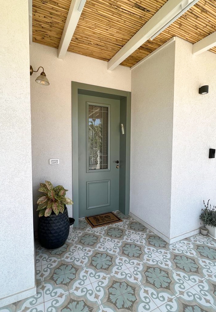 כניסה לבית בעיצוב אקלקטי-טבעי, המאופיינת בדלת ירוקה עם עבודת מתכת דקורטיבית, תקרה מבמבוק, ריצוף מעוטר בגוונים רכים וצמחייה צבעונית שמעניקה לחלל תחושת חמימות, קבלת פנים מזמינה ואופי ייחודי.