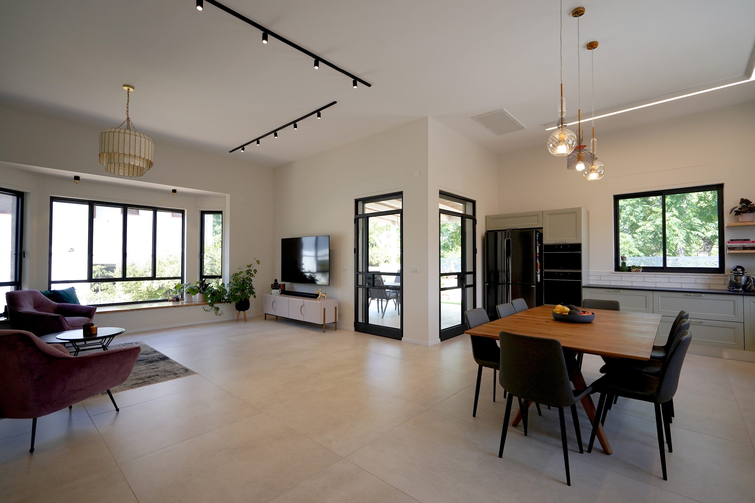החלל המרכזי מציג עיצוב פתוח ומואר, המשלב סלון, פינת אוכל ומטבח בהרמוניה נעימה. גווני הקרם, השחור והעץ יוצרים איזון בין חמימות לאלגנטיות. הריהוט מודרני ונקי, התאורה מגוונת וכוללת גופי תאורה דקורטיביים לצד מסילות ספוטים. החלונות הגדולים והדלתות השקופות מחברים בין הפנים לחוץ ומכניסים אור טבעי בשפע.