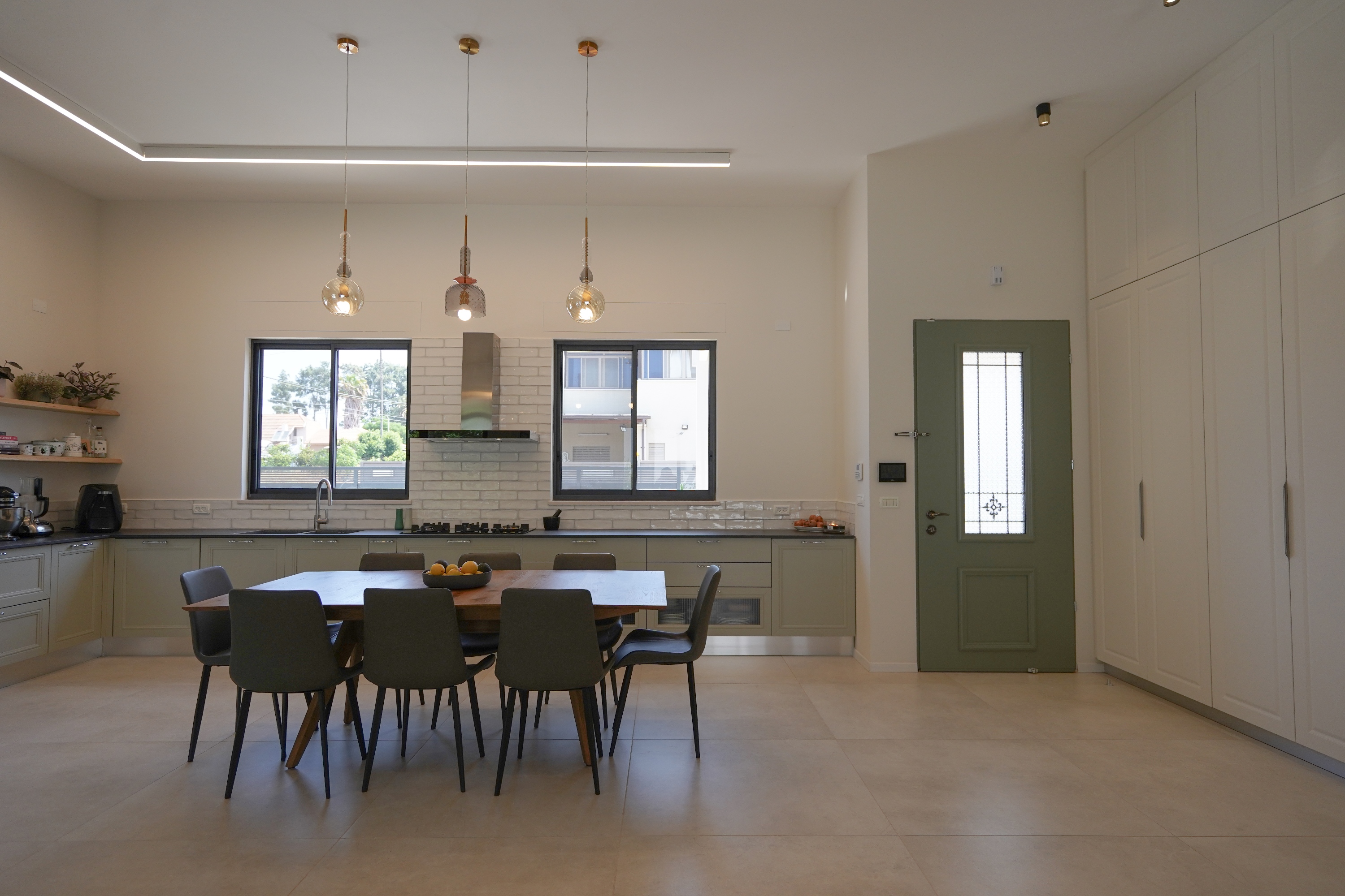 המטבח מעוצב בקווים נקיים ובשפה מודרנית-כפרית, עם חזיתות בגוון ירוק-אפור רך, משטח עבודה כהה וקרמיקה לבנה בגימור בריק. האור הטבעי שנכנס מהחלונות הרחבים יחד עם גוף התאורה המרכזי מוסיפים חמימות ורכות לחלל. פינת האוכל שבמרכז המטבח יוצרת חיבור נעים בין אזור הבישול למפגש המשפחתי.