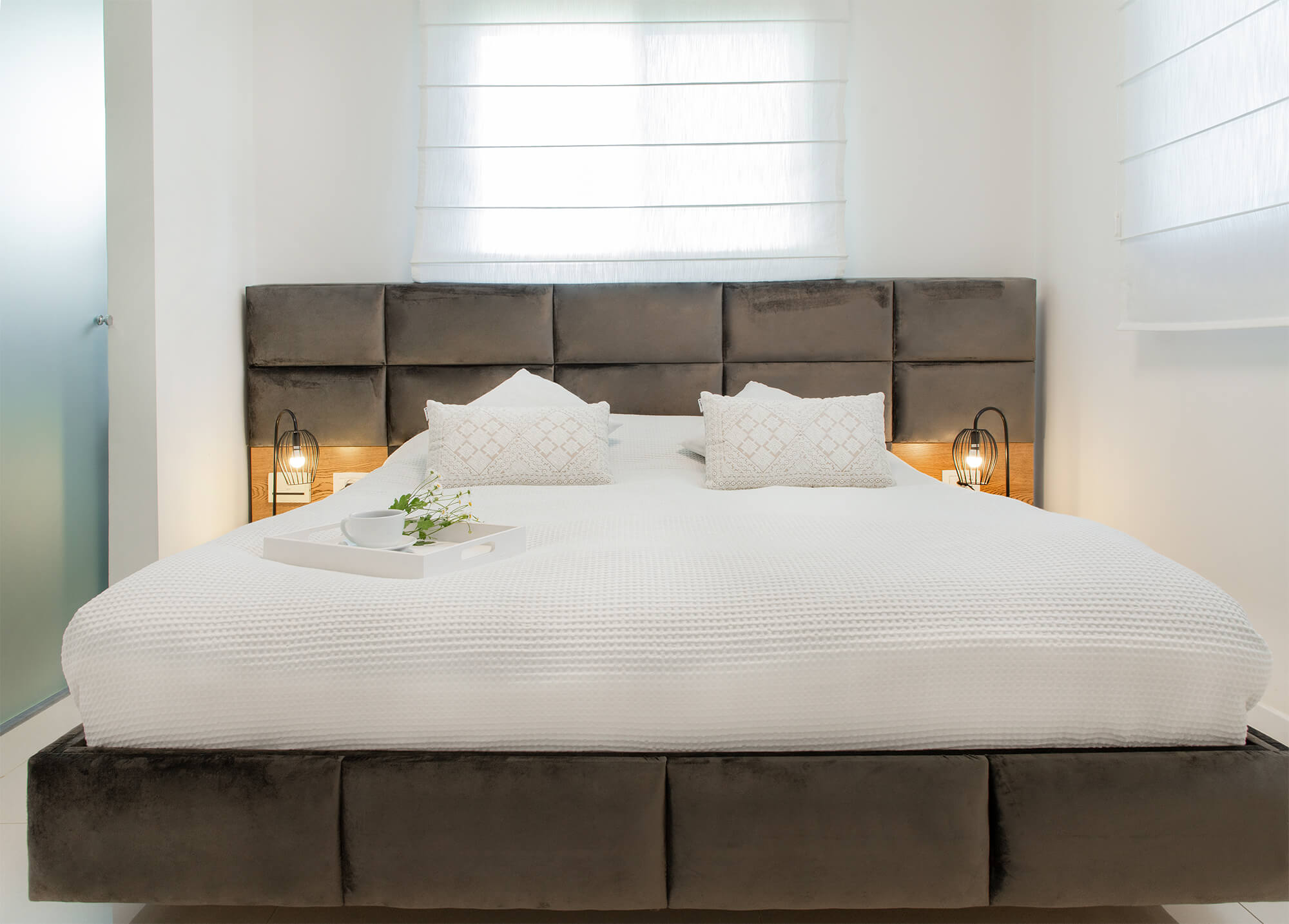 חדר שינה מודרני ומזמין עם מיטה בגוון כהה, מצעים לבנים ומגש אירוח עם קפה, שוקולדים ופרחים. תאורה חמימה מצדדי המיטה יוצרת אווירה של נוחות, רוגע וסטייל מוקפד.