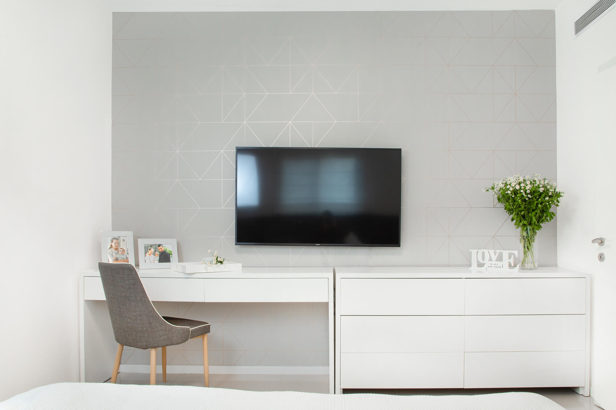 פינת עבודה מודרנית ומינימליסטית עם שולחן קיר לבן, קיר טפט גיאומטרי וטלוויזיה תלויה. כיסא אפור עם רגלי עץ ופרטי נוי עדינים יוצרים חלל מסודר, אלגנטי ונעים לשימוש יומיומי.