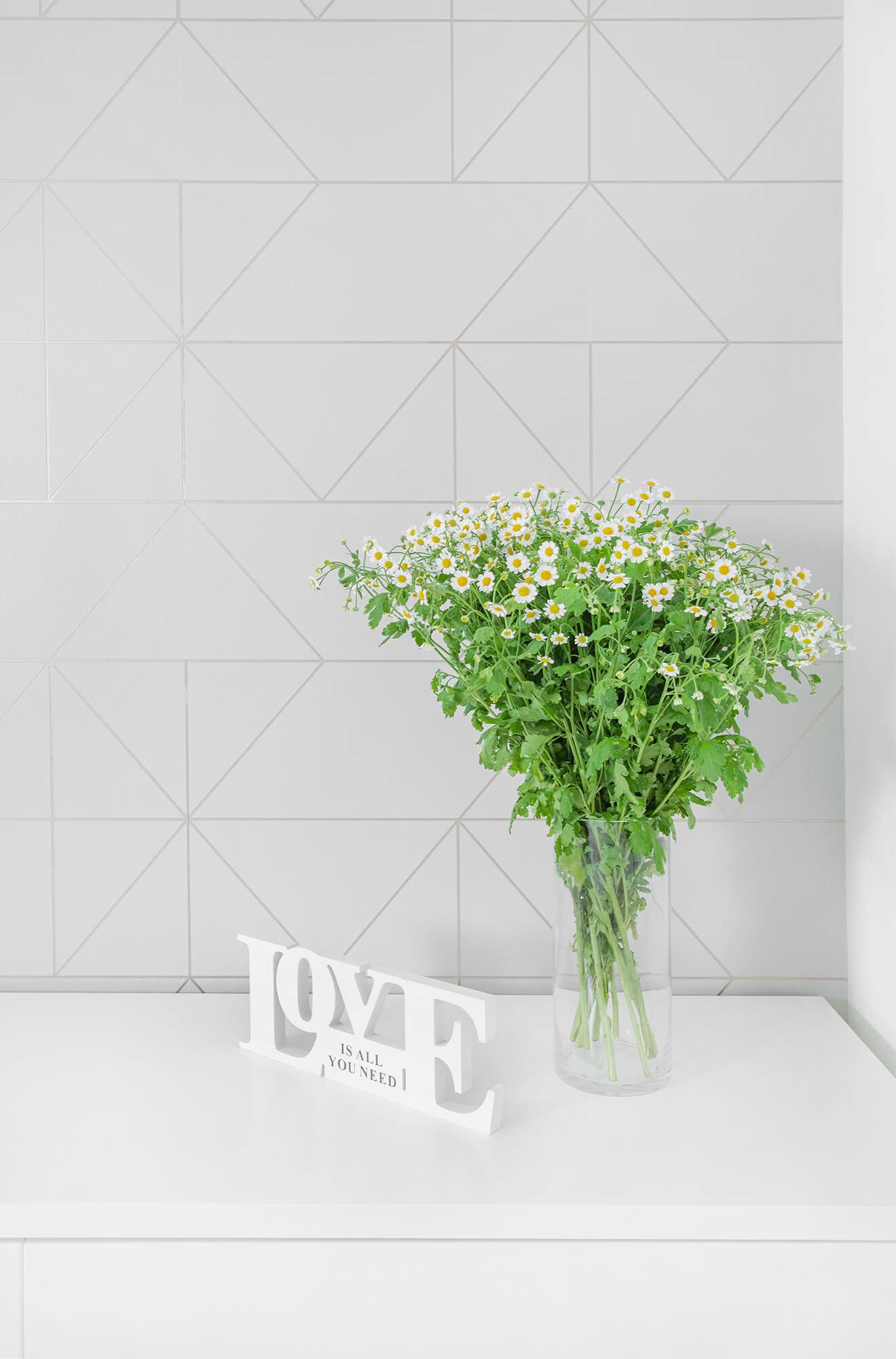 עיצוב מינימליסטי ונקי עם קיר גיאומטרי לבן, אגרטל קמומיל טבעי ושלט LOVE לבן – שילוב של רוך טבעי עם קווים מודרניים ליצירת אווירה רגועה ומעוצבת.