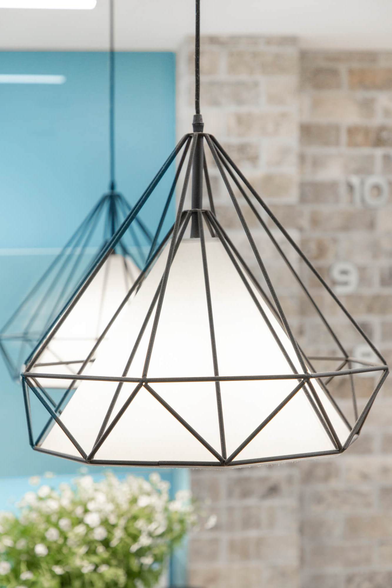 תאורה תלויה בעיצוב גיאומטרי מודרני עם גוף מתכת שחור ודיפיוזר לבן, על רקע קיר בריקים ומוטיבים טבעיים. שילוב של קווים חדים עם נגיעות ירוקות יוצר מראה עכשווי, עשיר בפרטים ויזואליים.