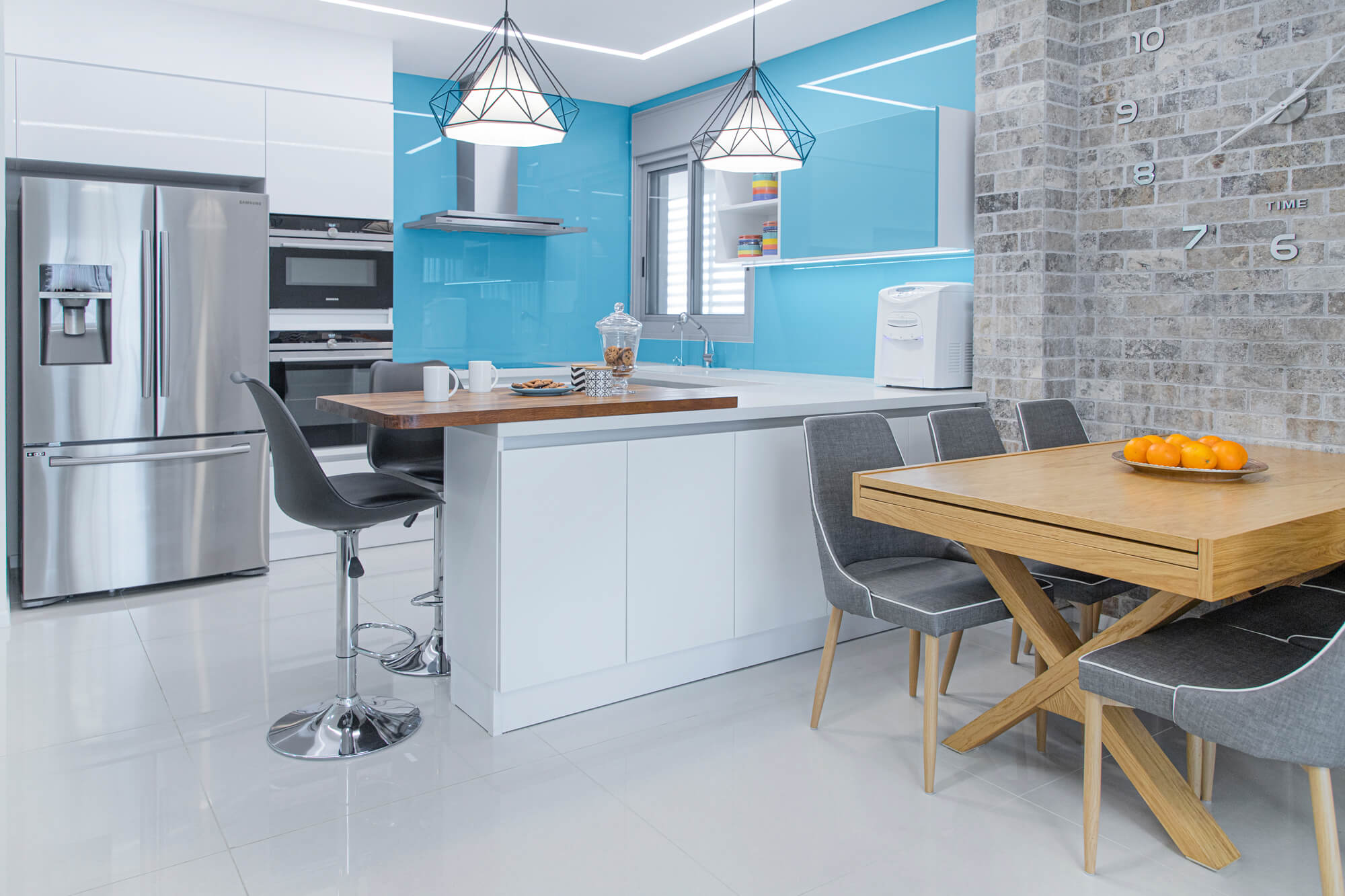 מטבח מודרני עם ארונות לבנים, חיפוי זכוכית כחול ומכשירי נירוסטה. אי עץ עם תאורה גיאומטרית מעליו, ואווירה מזמינה של נוחות ורוגע – שילוב של פונקציונליות עם עיצוב עכשווי.