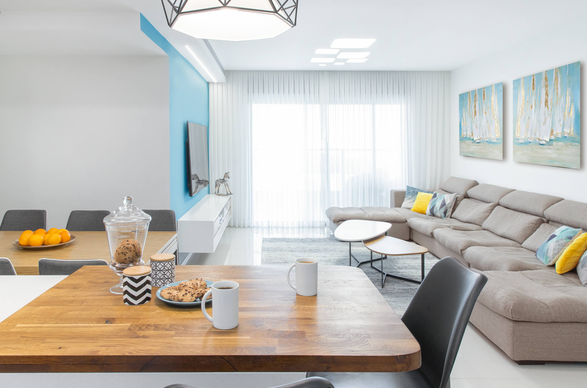 חלל מגורים פתוח ומואר בעיצוב מודרני, עם שולחן אוכל עץ, ספות בגוון בז' וכריות צבעוניות. קיר תכלת עם טלוויזיה ושעוני קיר מינימליסטיים, לצד תמונות מפרשיות – יוצרים אווירה נעימה, עכשווית ומזמינה.