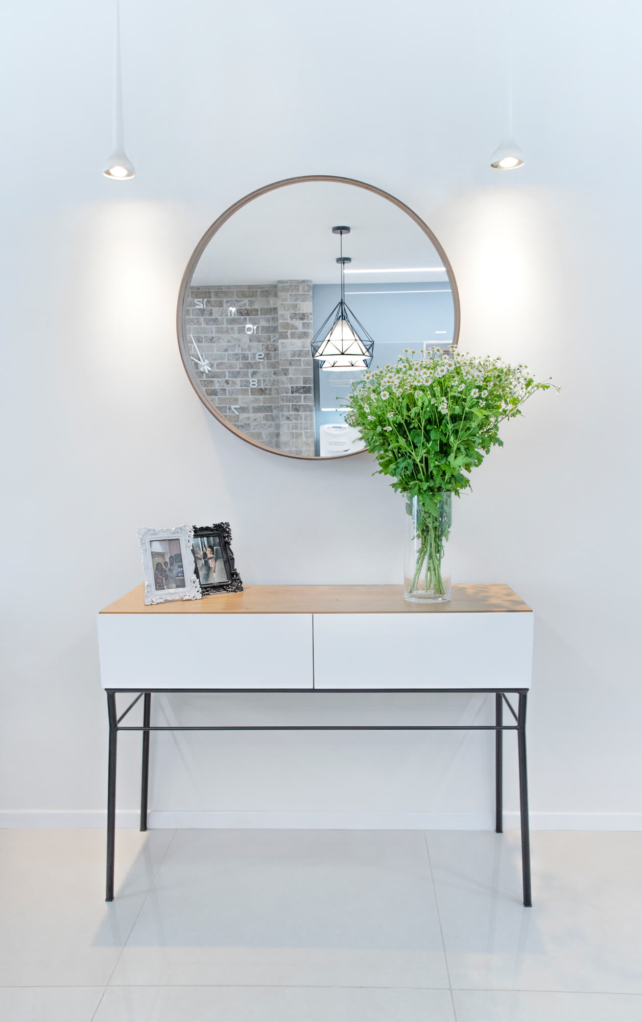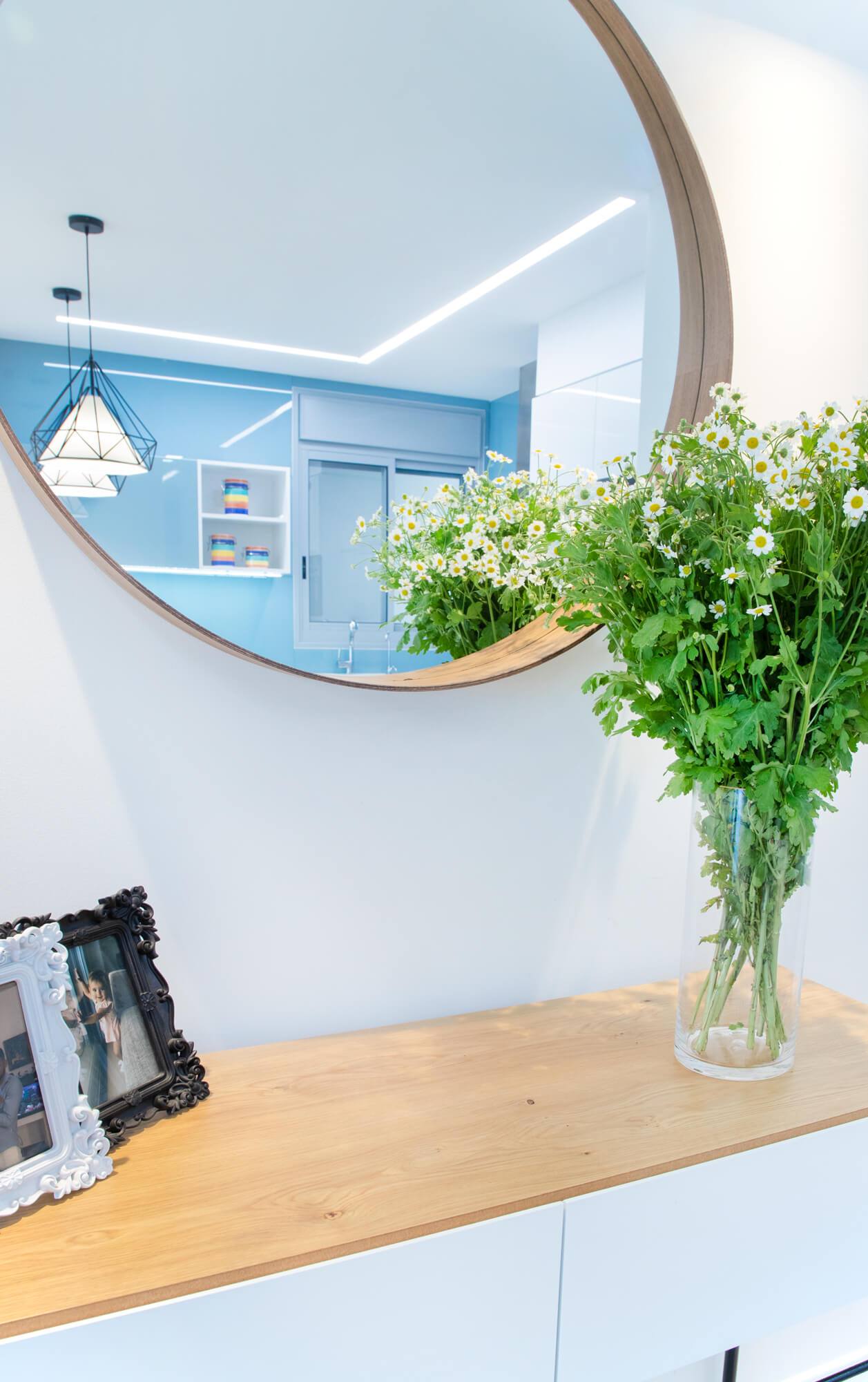 חלל מודרני עם עיצוב מינימליסטי, הכולל קונסולה עץ בהירה עם זר פרחים טרי בווז גדול ומראה עגולה מעץ המשתקפת את החדר. החדר מציג קירות לבנים וקיר כחול בהיר, תאורה תלויה בסגנון גיאומטרי וספרייה קטנה עם כלים צבעוניים, המשרה אווירה נקייה ומרווחת.