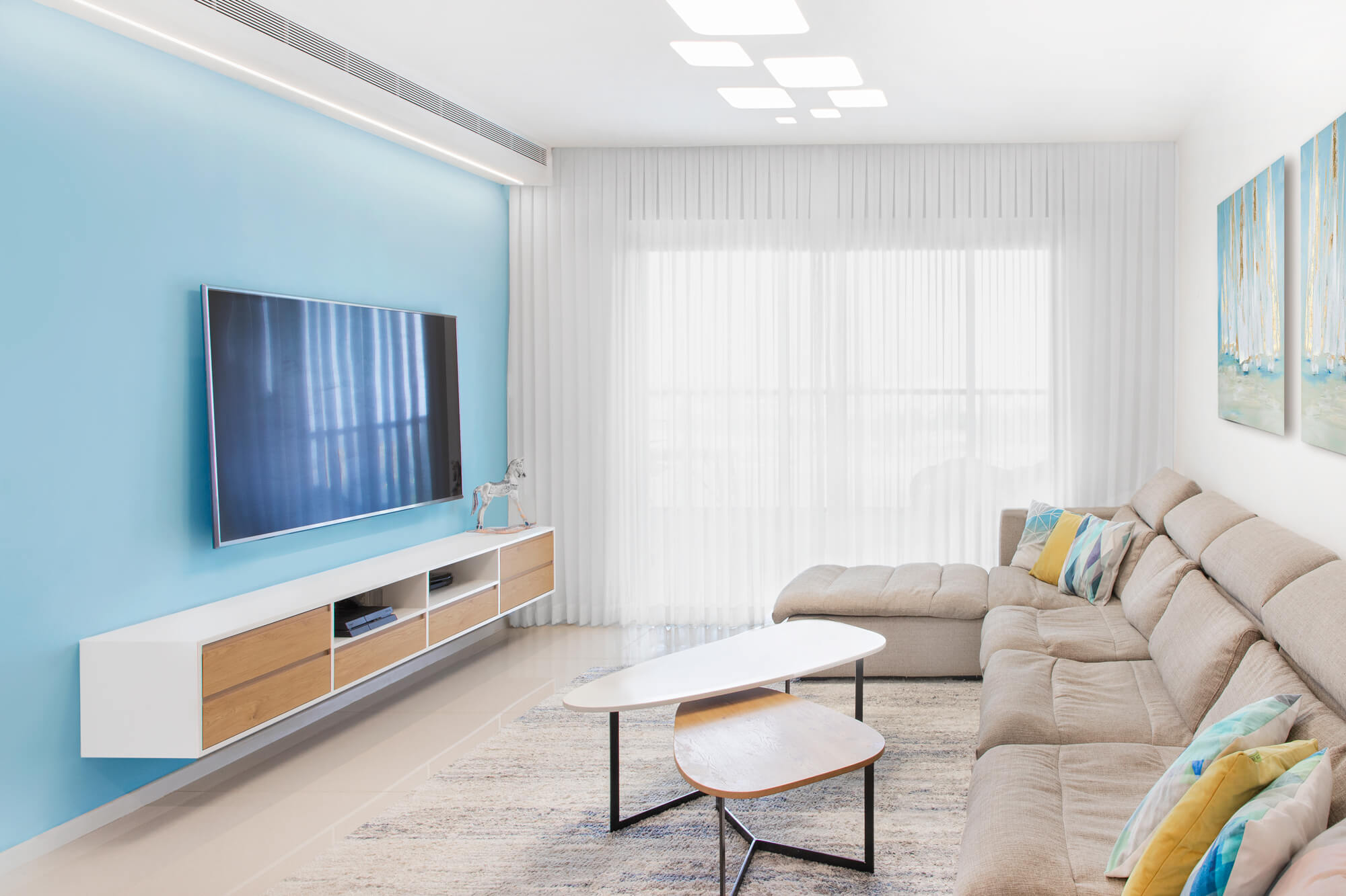 סלון מודרני ומואר בעיצוב מינימליסטי, עם ספה פינתית בגוון בז' וכריות צבעוניות. שולחנות קפה מעוצבים, קיר תכלת עם טלוויזיה ומדיה תלויה, ותמונות אבסטרקטיות בגווני כחול וירוק – יוצרים חלל נעים, מזמין ומעודכן.