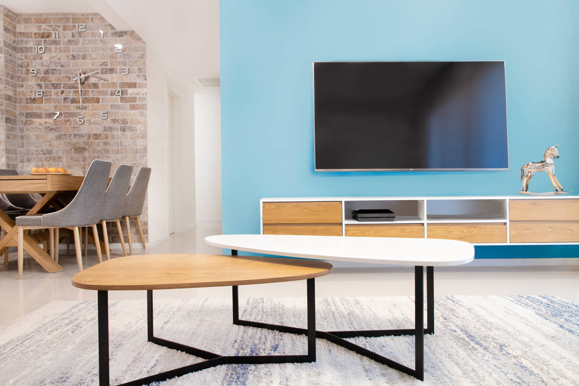 סלון ופינת אוכל בעיצוב מודרני עם קווים נקיים וגוונים טבעיים. קיר תכלת עם טלוויזיה ומדיה תלויה, שולחנות קפה משולשים על שטיח טקסטורלי, ושולחן אוכל עץ עם כיסאות אפורים מול קיר בריקים ושעון מינימליסטי – שילוב הרמוני של פונקציונליות וסטייל עכשווי.