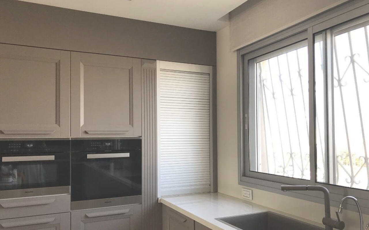 מטבח מודרני ומוקפד עם ארונות אפורים, משטח עבודה לבן ומכשירים מובנים. חלון עם תריס אפור ותאורת תקרה גיאומטרית יוצרים חלל פונקציונלי ומואר. קיר אבן עם טלוויזיה מוסיף טקסטורה ועניין עיצובי.
