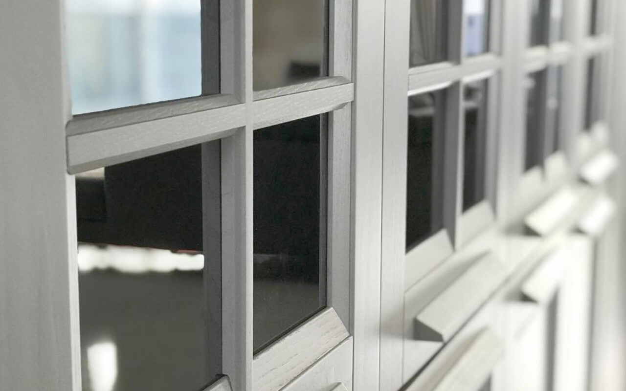מסגרת חלונות או דלתות זכוכית בעיצוב מודרני עם חלוקה סימטרית וקווים נקיים בגוון בהיר. ההשתקפות והאור הטבעי יוצרים עומק ותחושת מרחב, תוך שמירה על אסתטיקה מינימליסטית ואלגנטית.