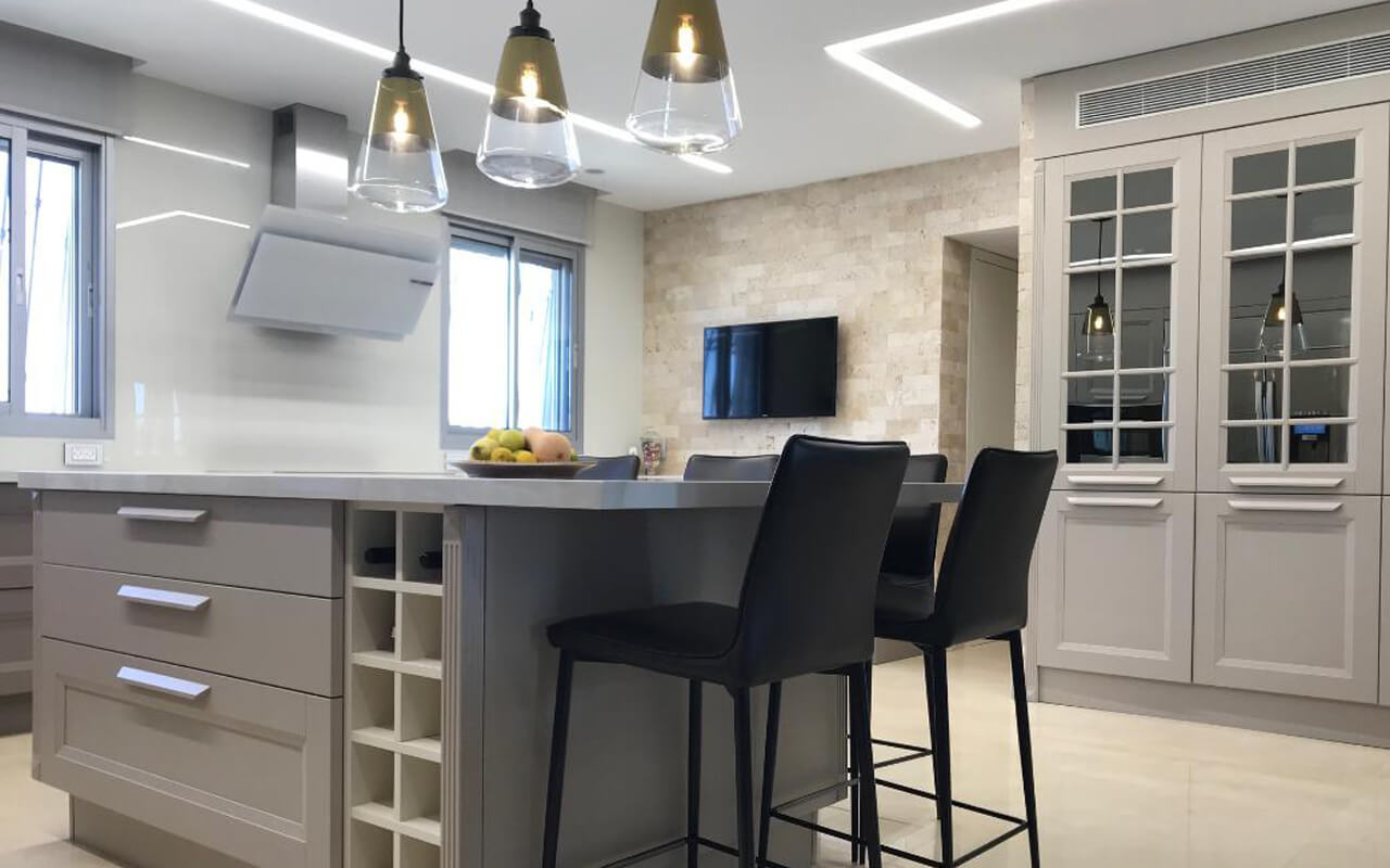מטבח מודרני עם אי מרכזי בגוון אפור בהיר ומשטח לבן, הכולל מדפי אחסון וכיסאות בר שחורים. תאורה תלויה מזכוכית, קיר אבן עם טלוויזיה, ארונות עם דלתות זכוכית ותקרה עם פסי לד יוצרים חלל פונקציונלי, אלגנטי ומואר.