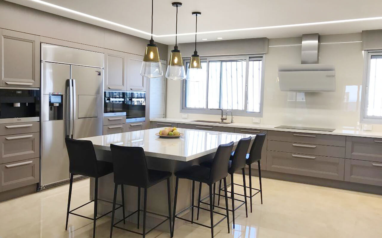 מטבח מודרני ומואר בעיצוב מינימליסטי עם אי מרכזי לבן וכיסאות שחורים. ארונות בגוון טאופ, תאורה תלויה ותקרה גיאומטרית עם תאורת לד יוצרים מראה נקי ואלגנטי. חלונות גדולים, מכשירים מובנים וטלוויזיה קירית משלימים חלל פונקציונלי ומעוצב בקפידה.