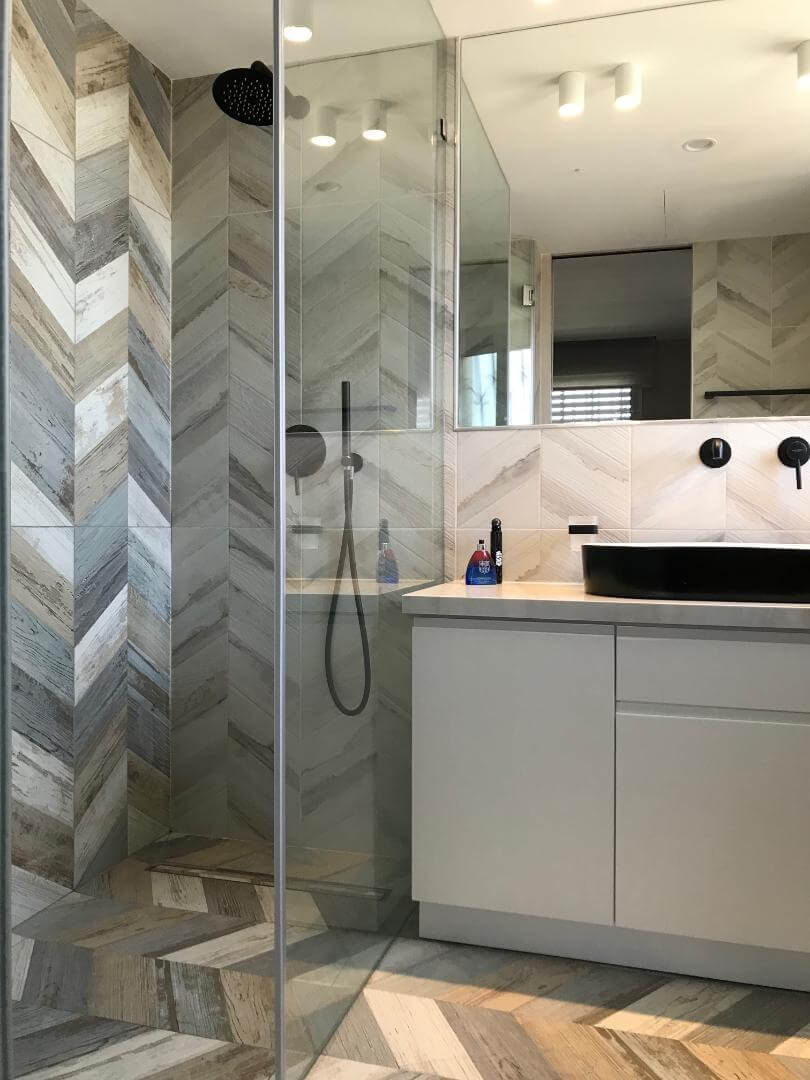 חדר רחצה מודרני עם מקלחון זכוכית, ראש גשם שחור וכיור עילי מלבני בגוון שחור על משטח לבן. חיפוי קירות ורצפה בדוגמת שברון בגווני אפור, בז' ולבן מוסיף עניין חזותי. תאורה שקועה ומראה גדולה משלימות את העיצוב האלגנטי והנקי.