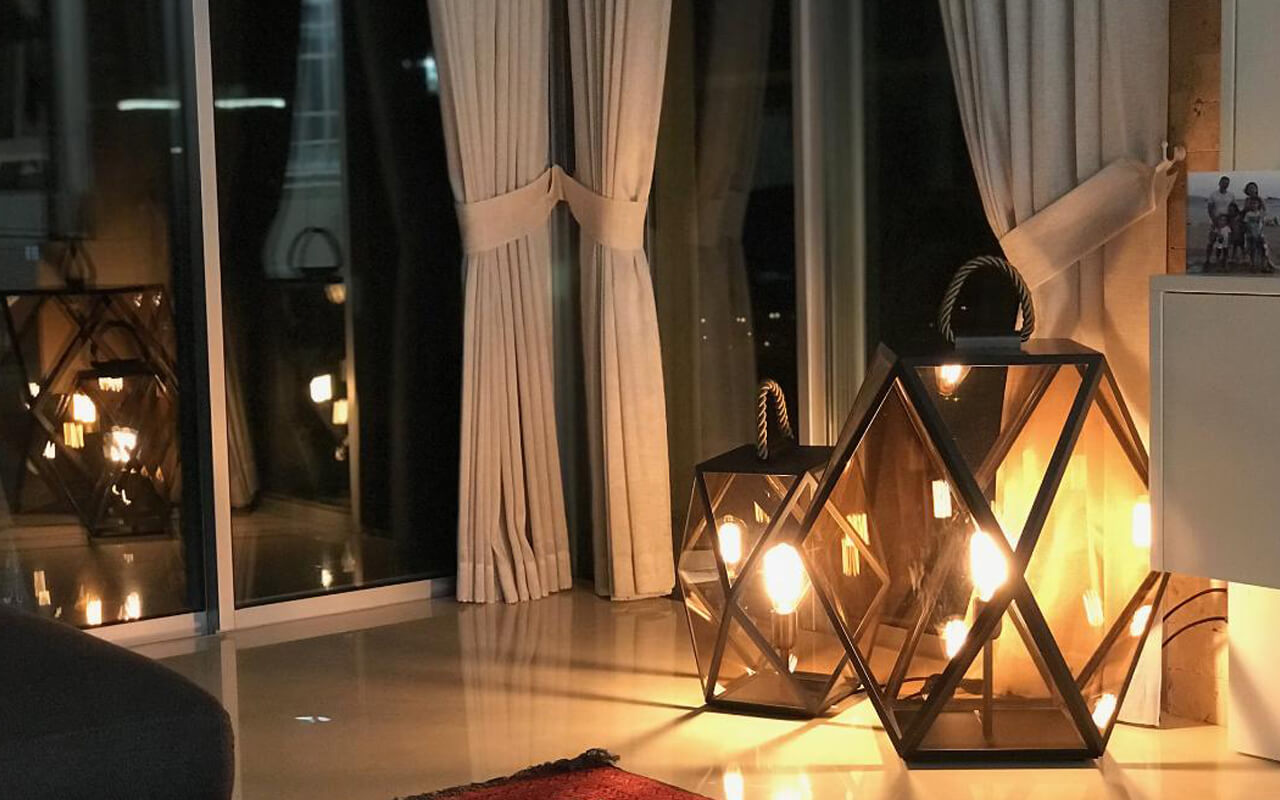 חלל אינטימי ומודרני עם שני פנסים גיאומטריים המפיצים אור חמים על רצפה מבריקה מול חלון זכוכית גדול. וילונות לבנים קשורים בעדינות, השתקפויות סימטריות ושטיח אדום יוצרים אווירה רגועה, אלגנטית ומזמינה.