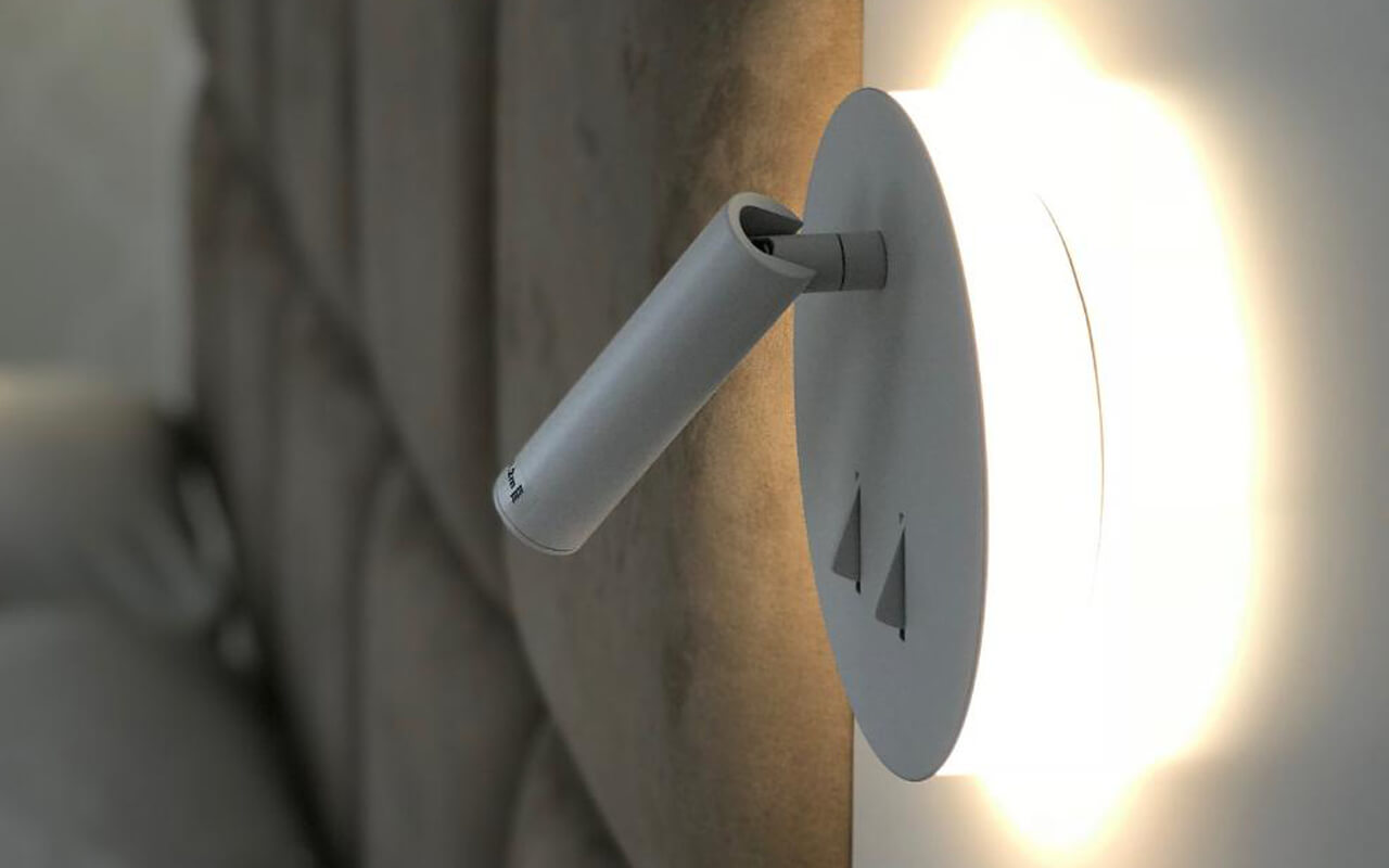 גוף תאורה קיר עגול עם זרוע גלילית מתכווננת מפיץ אור חמים לצד גב מיטה מרופד. העיצוב מינימליסטי ומודרני, מותאם לקריאה או תאורה אווירתית בחדר שינה אלגנטי ונעים.