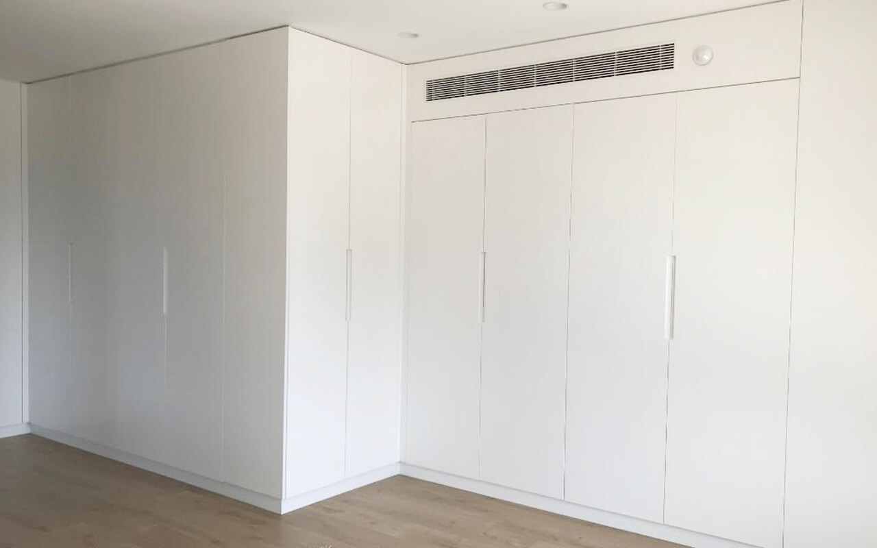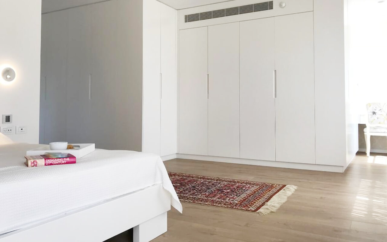 חלל אחסון מודרני ומינימליסטי עם ארונות לבנים מובנים לאורך שני קירות, בעלי חריצים אנכיים לפתיחה ללא ידיות. רצפת עץ בהירה ופתח אוורור עליון משתלבים בעיצוב נקי, פונקציונלי ואסתטי, המדגיש פתרונות אחסון חכמים בסביבה מעוצבת.