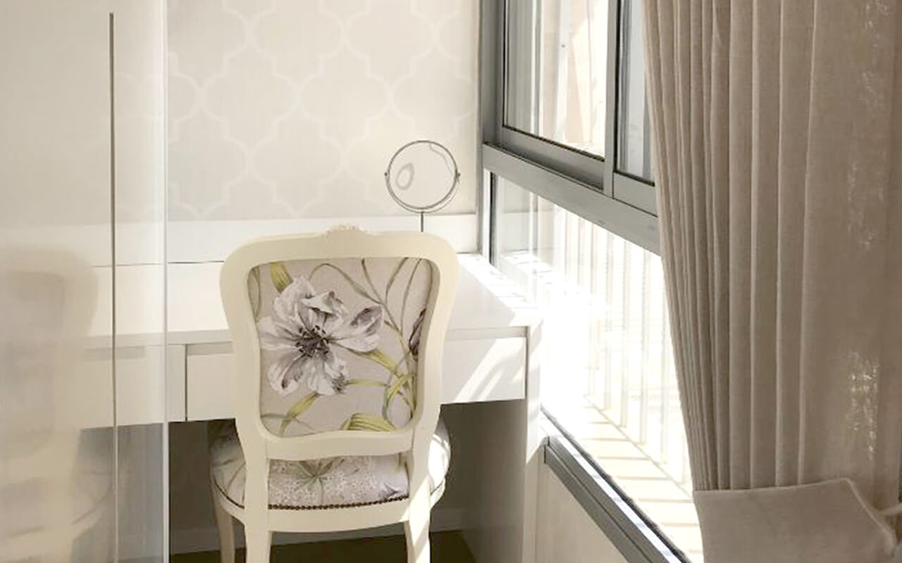 פינת עבודה קומפקטית ומוארת עם שולחן וכיסא לבנים, מרופד בדוגמת פרחים בגווני אפור וירוק. חלון גדול עם תריסים אנכיים מכניס אור טבעי, וטפט גיאומטרי עדין על הקיר מוסיף אלגנטיות. עיצוב מינימליסטי שמזמין ריכוז ונוחות.