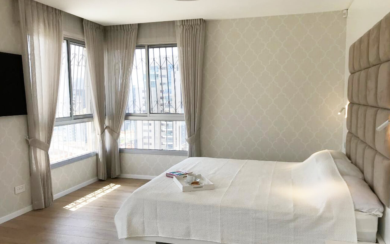 חדר שינה מודרני ומואר עם מיטה לבנה, גב מרופד בגוון בז', וטפט עדין על הקיר. מגש עם ספר וכלים מוסיף נגיעה אישית, בעוד שחלונות גדולים עם וילונות שקופים מכניסים אור טבעי. רצפת עץ בהירה וטלוויזיה קירית משלימים את האווירה הנקייה והנעימה.
