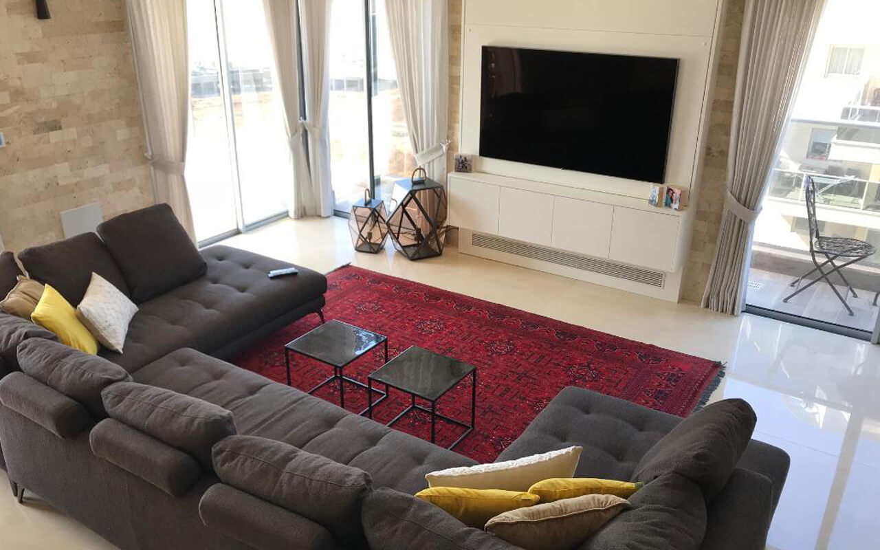 סלון מודרני ומואר עם ספה אפורה, שטיח אדום מעוטר ושולחן צד מזכוכית. טלוויזיה תלויה על קיר לבן עם נישות דקורטיביות, ולצידה פנסים גיאומטריים. קיר אבן בגוון בז' מוסיף חמימות, ודלתות זכוכית גדולות פותחות את החלל לנוף עירוני. העיצוב משלב אלגנטיות עם תחושת פתיחות ונוחות.