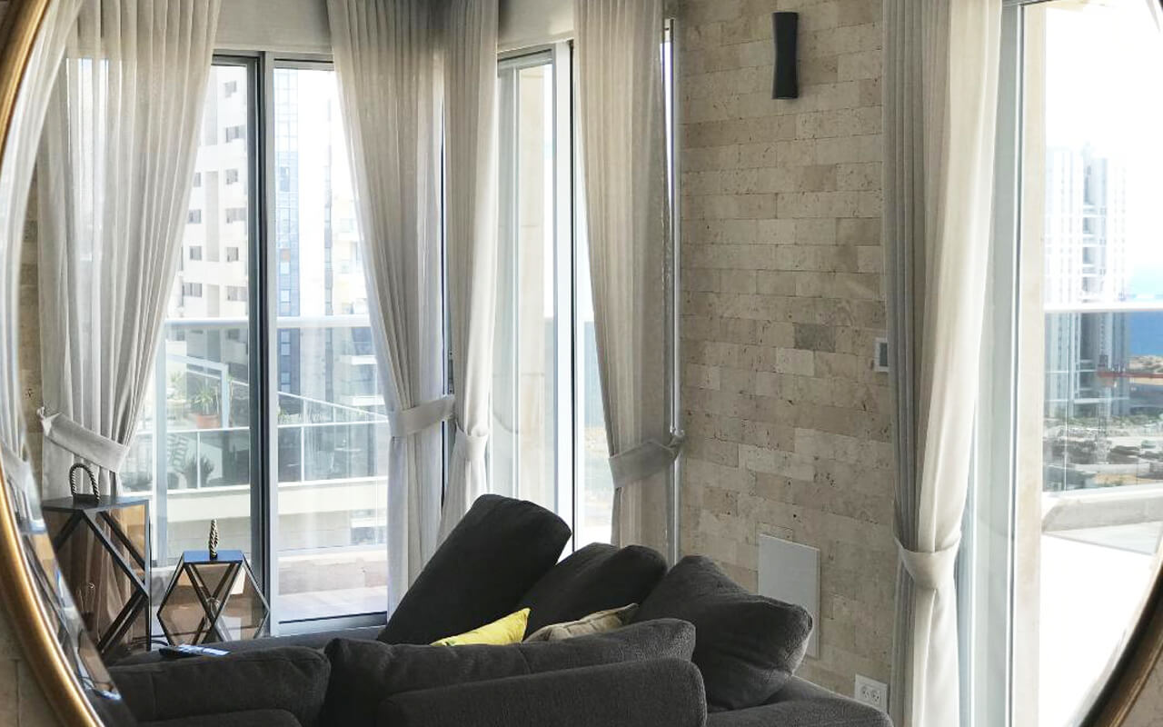 סלון עירוני בעיצוב עכשווי, עם ספה אפורה, קיר אבן בגוון בז' ותאורה קיר שחורה. החלל מצולם דרך מראה עגולה, מה שמדגיש את תחושת העומק והאור הטבעי הנשפך מהחלונות הגדולים הפונים לנוף עירוני.
