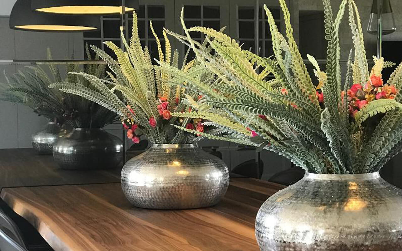 שולחן עץ טבעי עם שני אגרטלים מתכתיים במרקם פטיש, מלאים בפרחים מלאכותיים בגווני ירוק, אדום וורוד. התאורה העילית העגולה וההשתקפות במשטח מבריק יוצרים קומפוזיציה סימטרית ומרשימה בעיצוב מודרני ומוקפד.