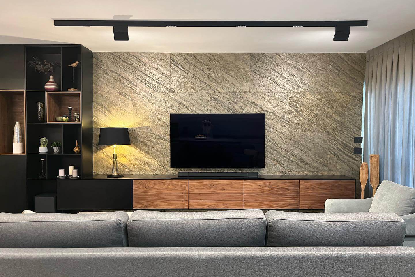 קיר טלוויזיה בעיצוב מודרני־אלגנטי, מחופה אבן טבעית בגוון אפור־בז’ עם טקסטורה עשירה. מזנון משולב עץ אגוז ושחור מט מוסיף חמימות ותחכום, לצד מדפי נוי פתוחים בתכנון נקי. התאורה הרכה והווילונות הבהירים מאזנים את המראה ויוצרים חלל סלוני הרמוני ומזמין.