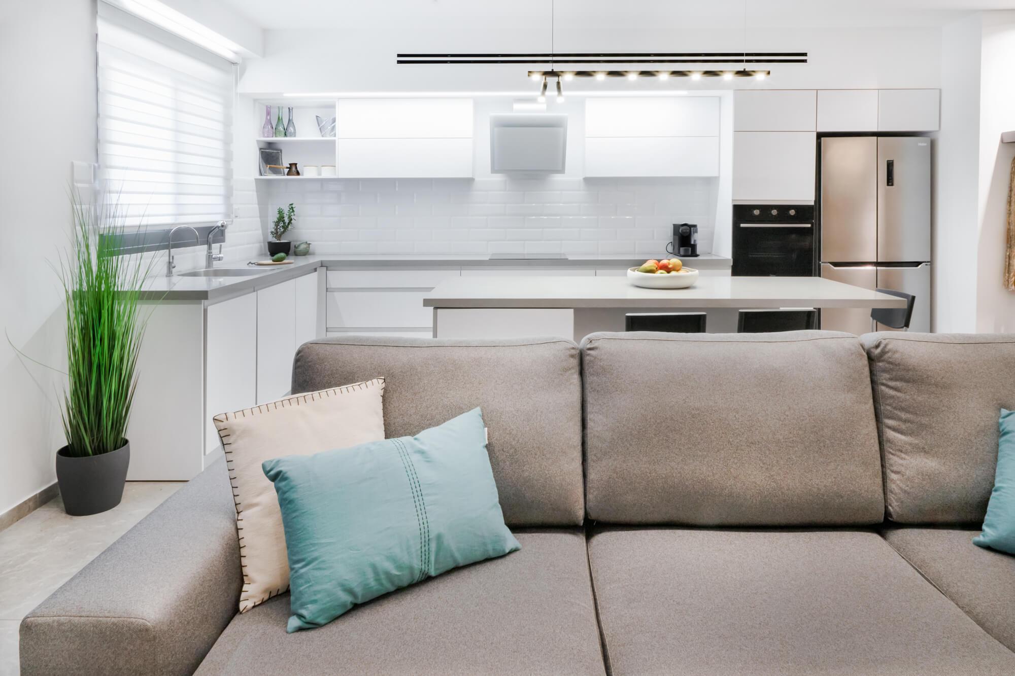 חלל פתוח בעיצוב מודרני ומינימליסטי, המשלב מטבח וסלון בגוונים ניטרליים עם נגיעות צבע רכות, תאורה טבעית נדיבה, וריהוט פונקציונלי שמייצר זרימה הרמונית ונעימה בין אזורי המגורים.