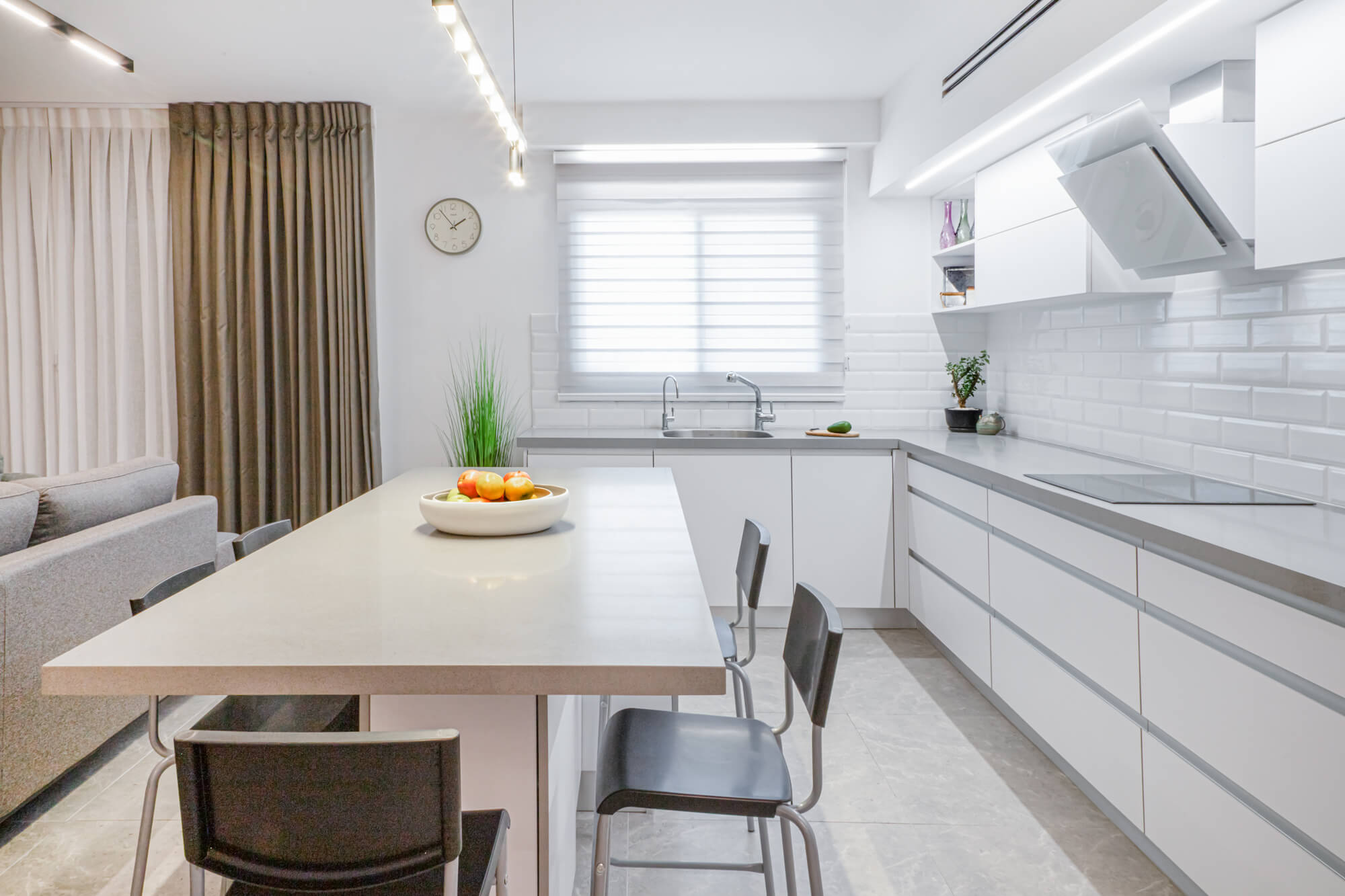 מטבח בעיצוב מודרני ומינימליסטי, המאופיין בקווים נקיים, גוונים בהירים, תאורה טבעית ותכנון פונקציונלי שמייצר תחושת מרחב, סדר ונוחות לשימוש יומיומי.