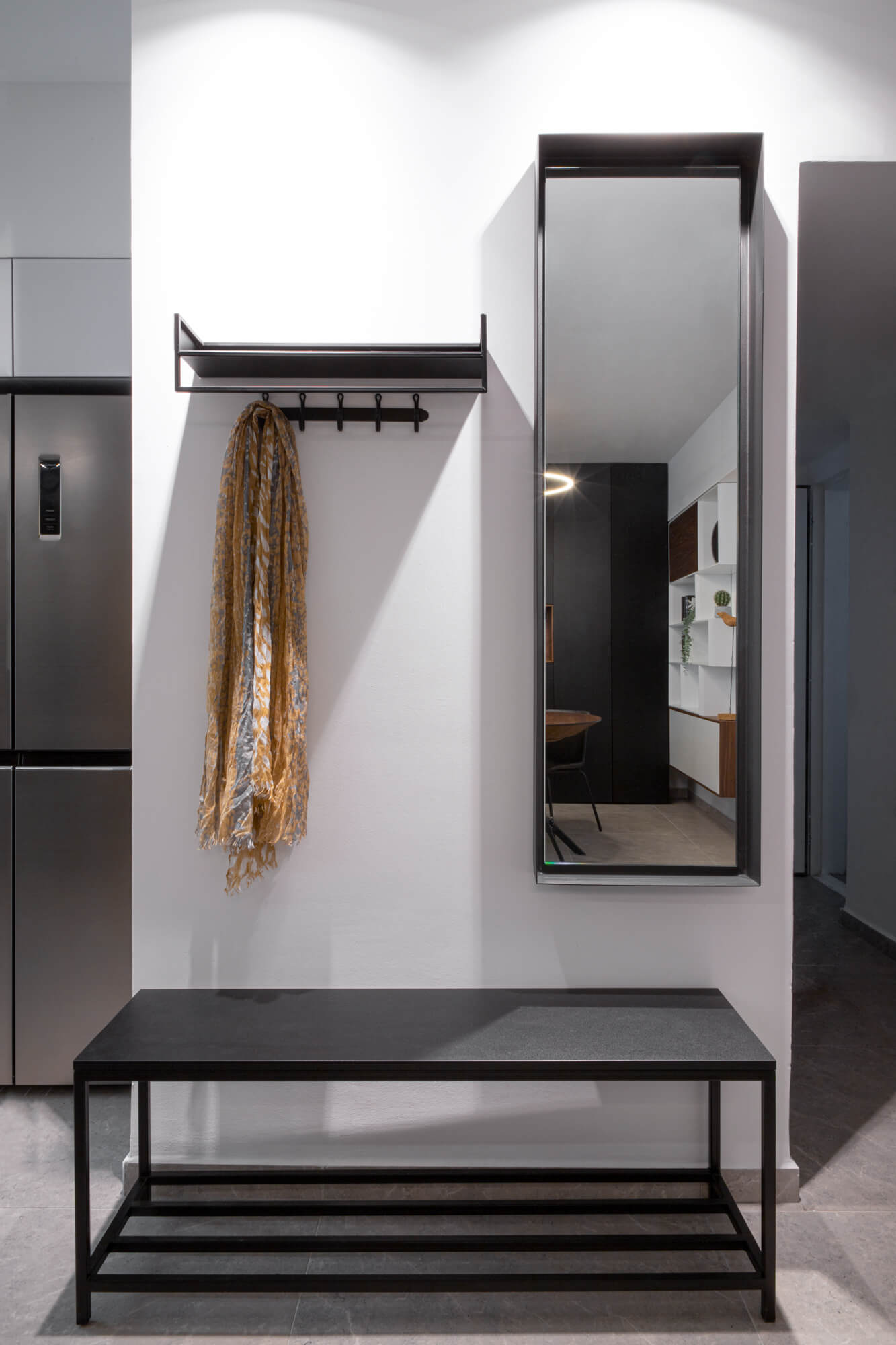 מבוא כניסה בעיצוב מינימליסטי-תעשייתי, המאופיין בקווים ישרים, שילוב מתכות כהות עם גוונים ניטרליים, ופתרונות אחסון פונקציונליים שמייצרים תחושת סדר, ניקיון וזרימה טבעית לחלל הבית.