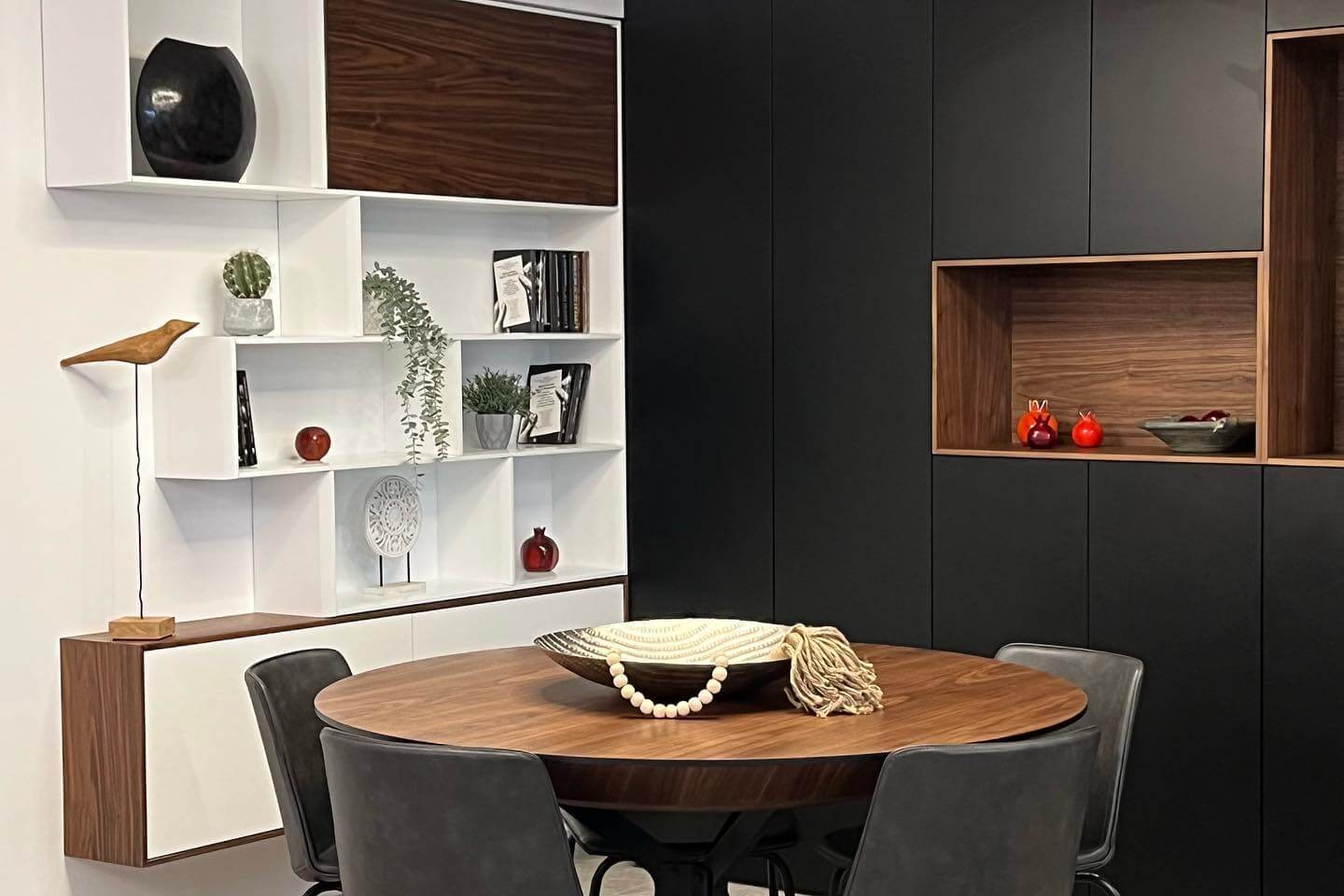 פינת אוכל מודרנית המאופיינת בשילוב חומרים טבעיים כמו עץ כהה, קווים נקיים וקומפוזיציה מדויקת של מדפים פתוחים וסגורים, היוצרים עומק חזותי ואווירה חמימה ומאורגנת.