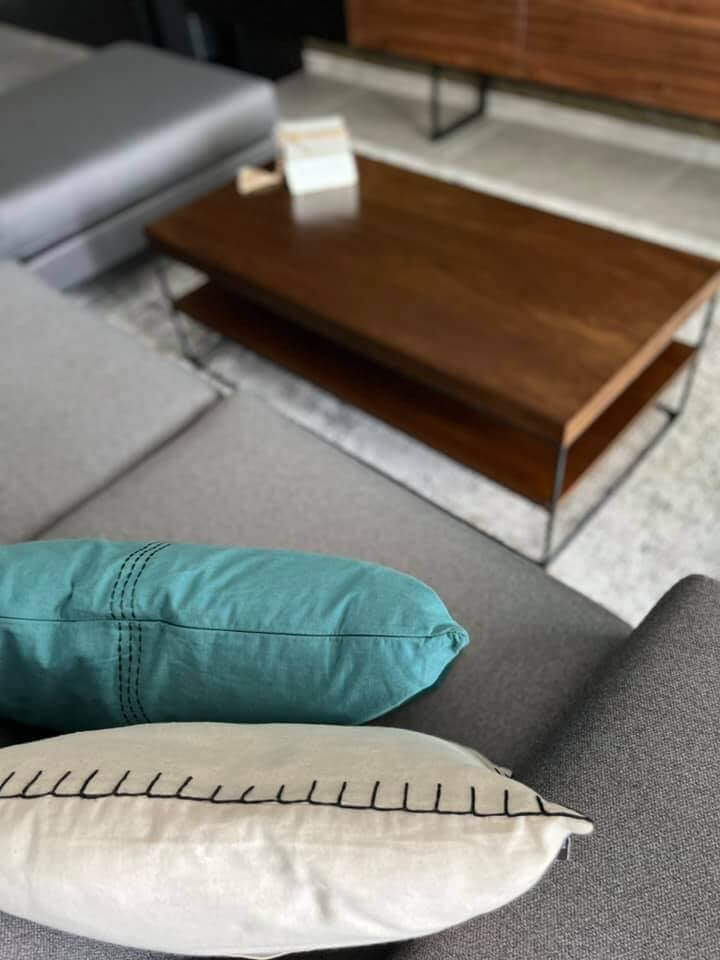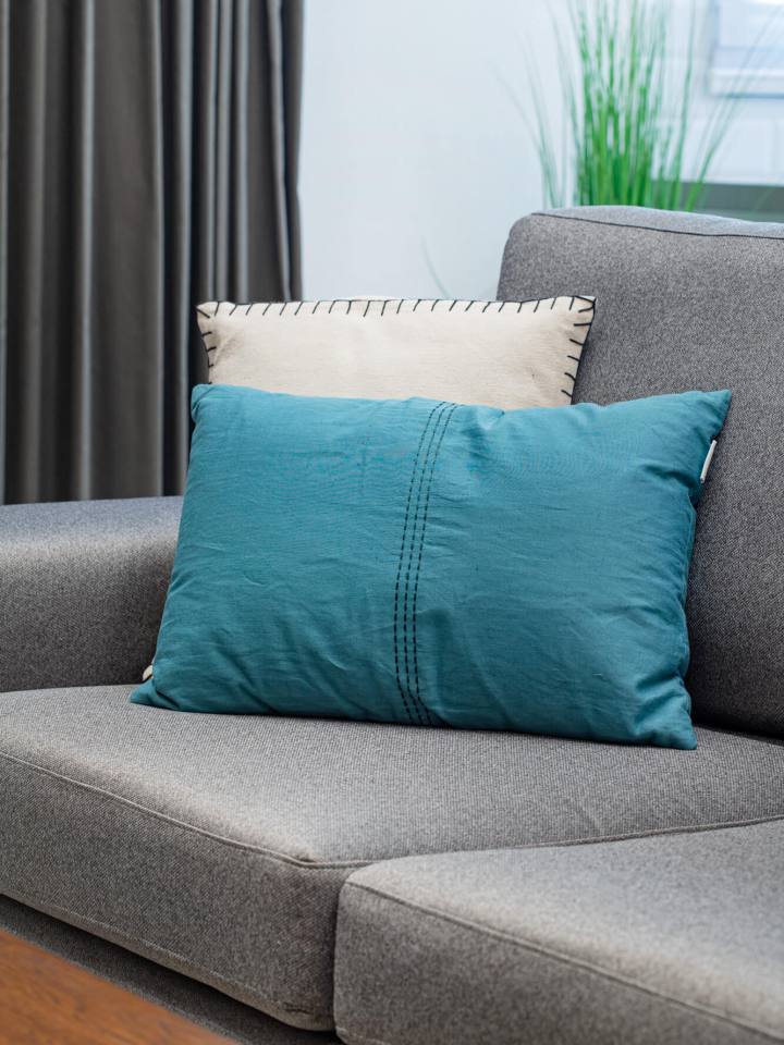 פרט עיצוב עדין המעניק חמימות ורוך לפינת הישיבה – כריות דקורטיביות בגווני טורקיז ושמנת על ספה אפורה במרקם רך. השילוב בין הצבעים מוסיף נגיעה טבעית ורעננה, היוצרת תחושת נוחות והרמוניה עיצובית בחלל.