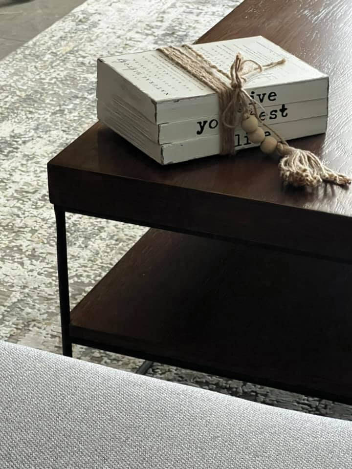 אלמנט עיצובי דקורטיבי בסגנון כפרי-מודרני, המשלב חומרי עץ טבעיים, טקסטורות רכות ופרטי טקסט שמעוררים תחושת חמימות, השראה ונוכחות אישית בחלל המגורים.