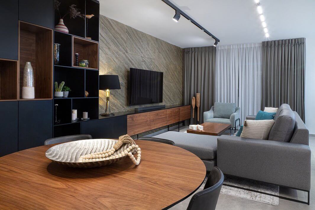 חלל סלון חמים ומודרני בעיצוב מאוזן ונקי. קיר טלוויזיה מחופה אבן טבעית בגוון אפור־בז’ משתלב עם מזנון עץ אגוז ושחור מט, ומדפי נוי פתוחים במראה גאומטרי. פינת הישיבה האפורה עם נגיעות טורקיז ושטיח בהיר משלימה אווירה אלגנטית ונעימה, כשהתאורה והווילונות הרכים מדגישים את תחושת הרוגע וההרמוניה.